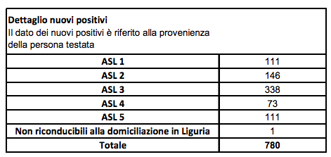 In Liguria i nuovi positivi sono 780. Ecco il dettaglio dei nuovi positivi riferito alla residenza della persona testata (ieri erano 154):