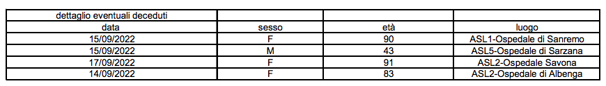 Quattro i decessi registrati in tutto il territorio regionale; tra cui una donna di 90 anni, morta all’ospedale di Sanremo.