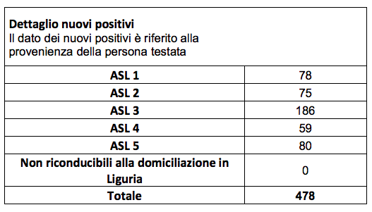 In Liguria i nuovi positivi sono 478 (ieri erano 780). Ecco il dettaglio dei nuovi positivi riferito alla residenza della persona testata: