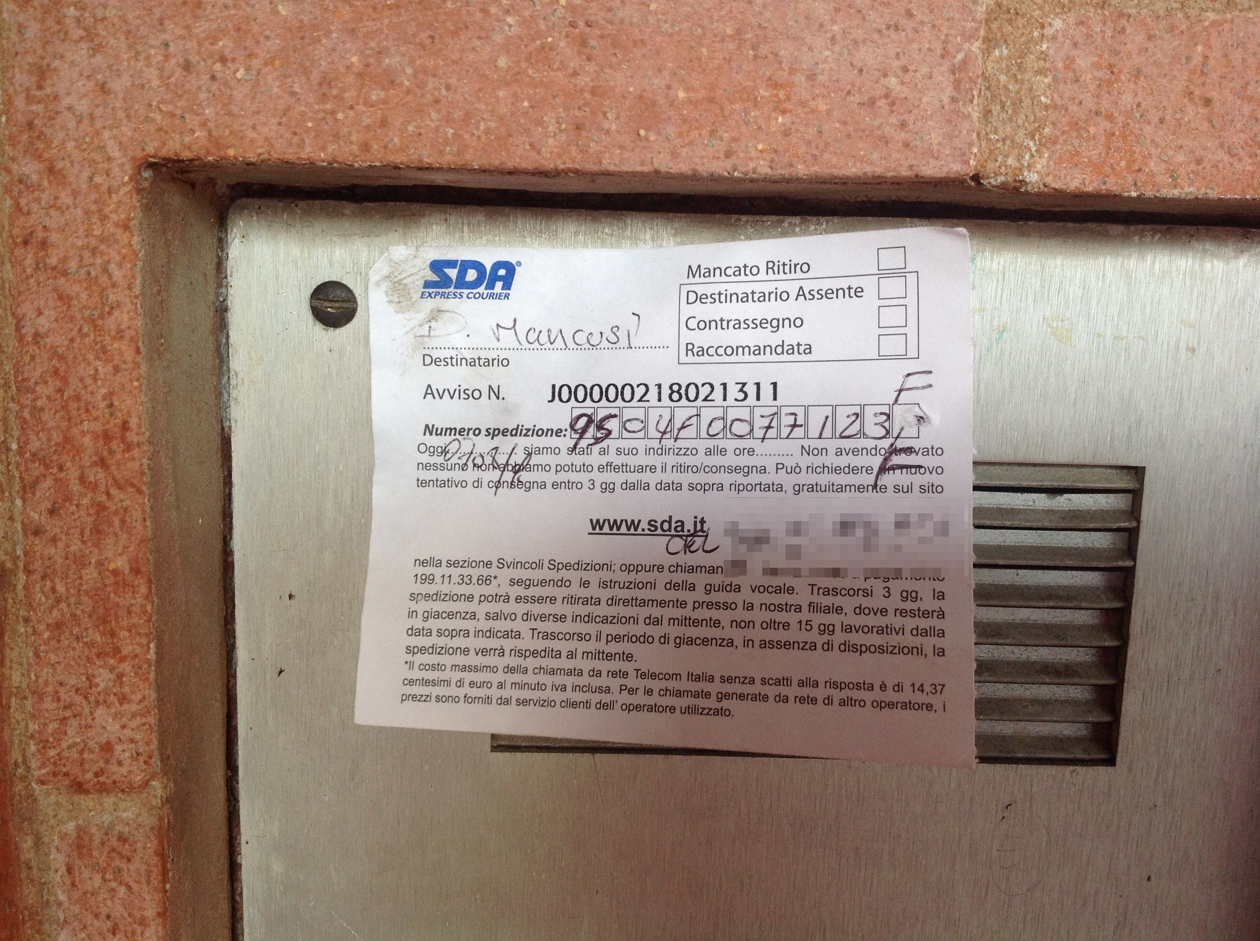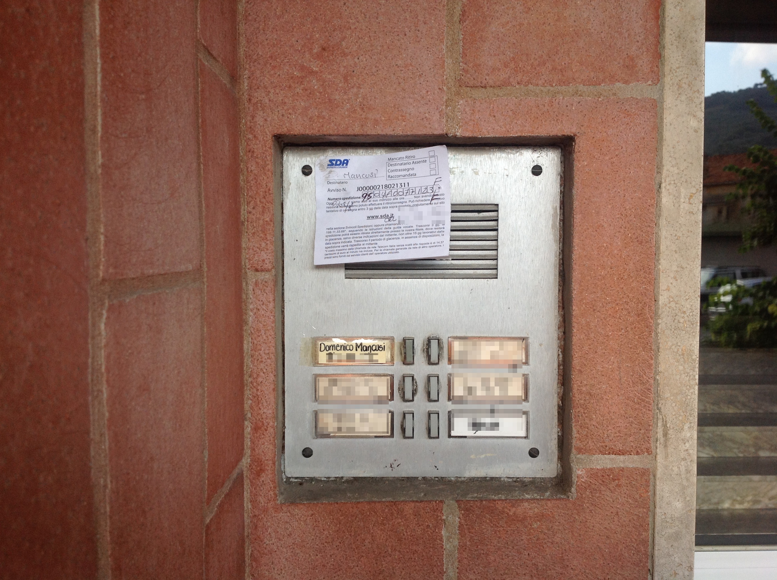 Imperia. Sul citofono c’è il secondo nome, Domenico Mancusi, e un biglietto attacato con dello scotch lasciato lì dal corriere della SDA che doveva consegnare un pacco, ma il destinatario ovviamente non era in casa.