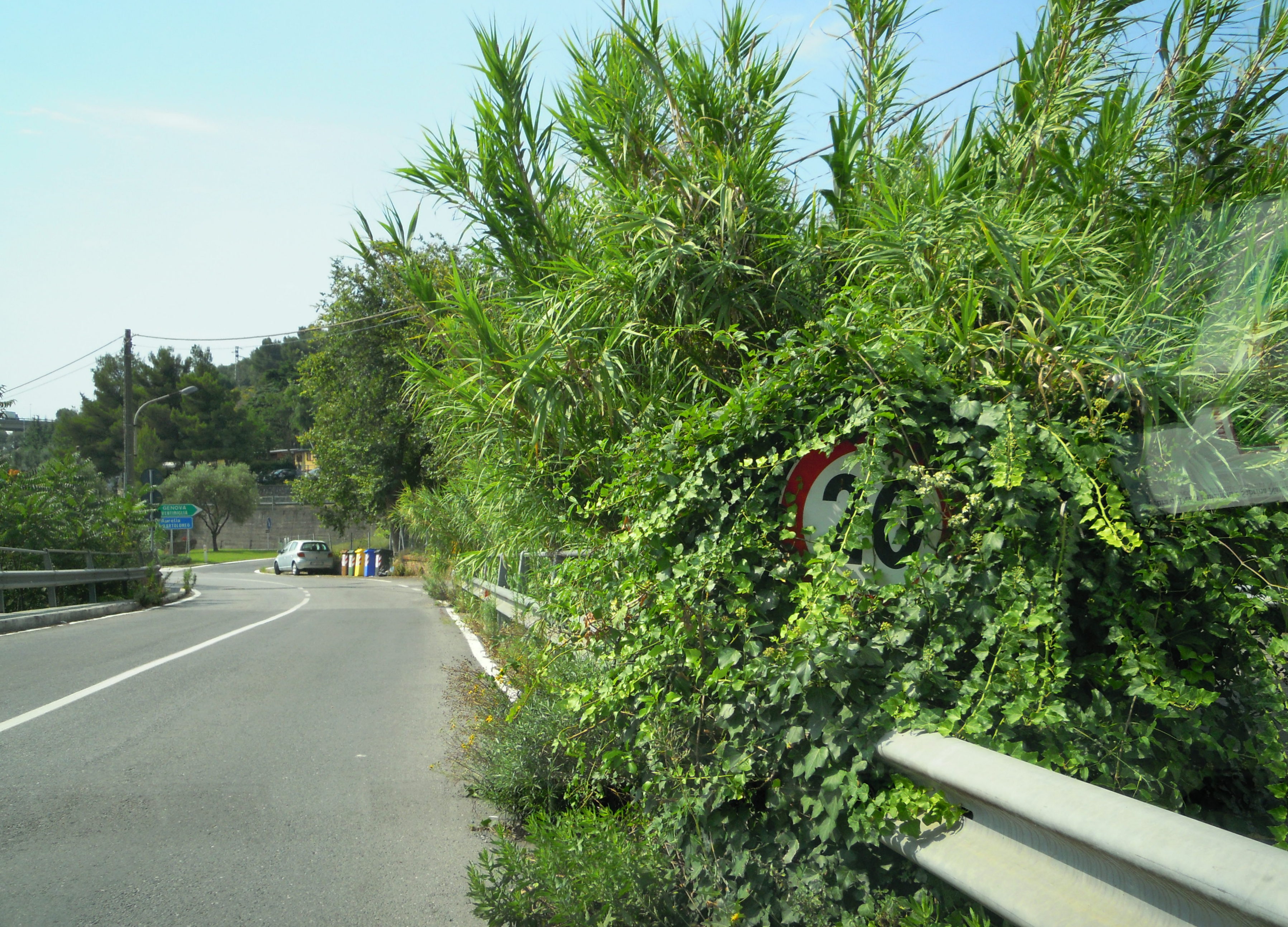- Sul ponte dei Viali, il cartello con il limite di velocità dovrebbe indicare il pericolo rappresentato dai veicoli in uscita dallo svincolo autostradale che si intravvede sullo sfondo. Però non si vede più il cartello, inghiottito da frasche che invadono anche la sede stradale ….