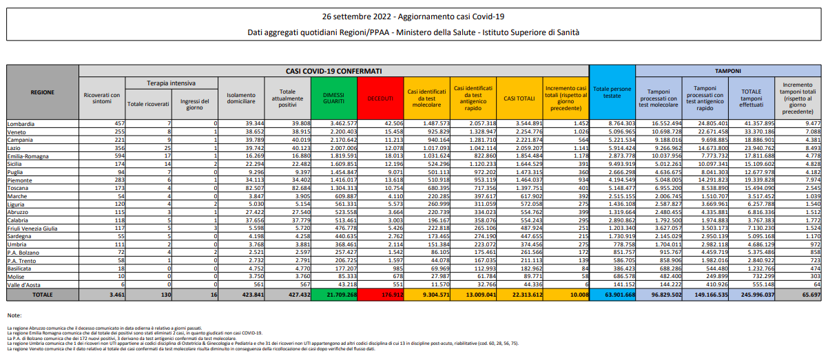 Covid, Italia: il bollettino di lunedì 26 settembre