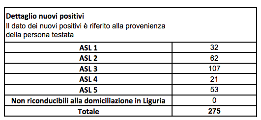 In Liguria i nuovi positivi sono 275. Ecco il dettaglio dei nuovi positivi riferito alla residenza della persona testata: