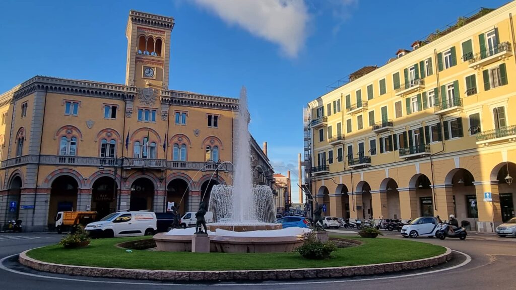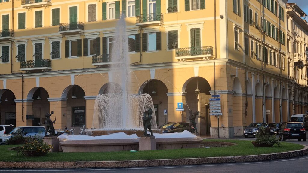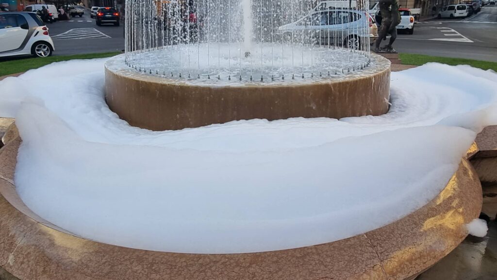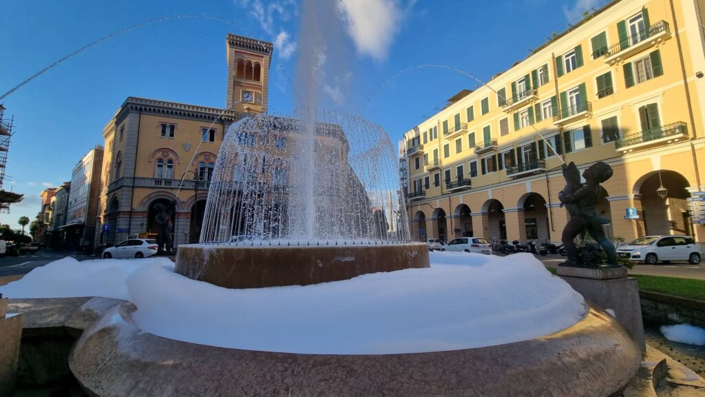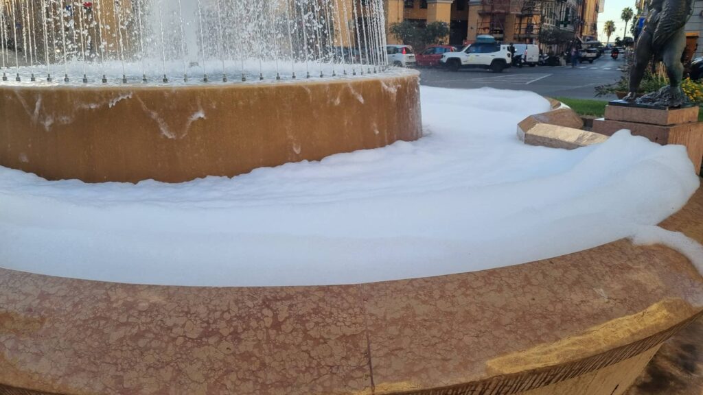 Fontana di piazza Dante piena di schiuma. E’ successo questa mattina, martedì 27 settembre, a Imperia.