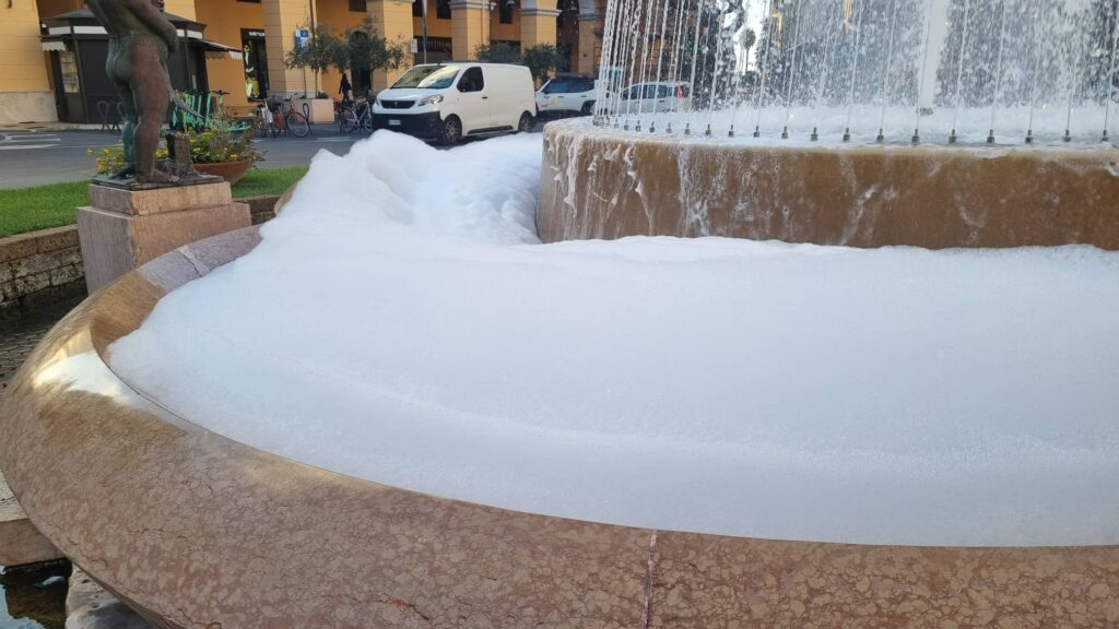 A provocare la formazione della schiuma del detersivo per piatti versato nell’acqua della fontana, tanto che a pochi metri dalla fontana è stato trovato un contenitore vuoto.