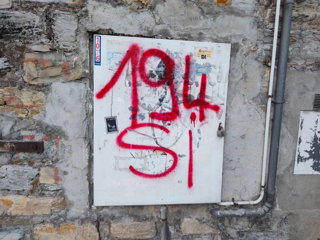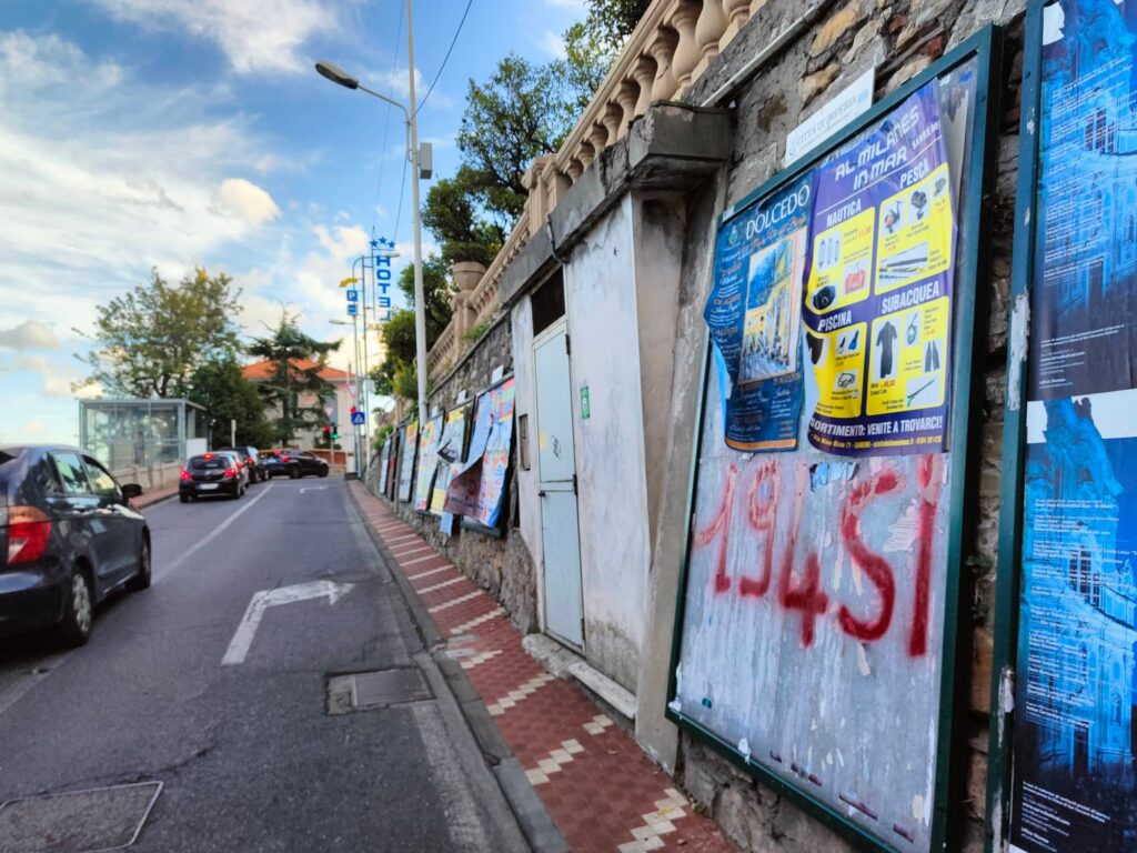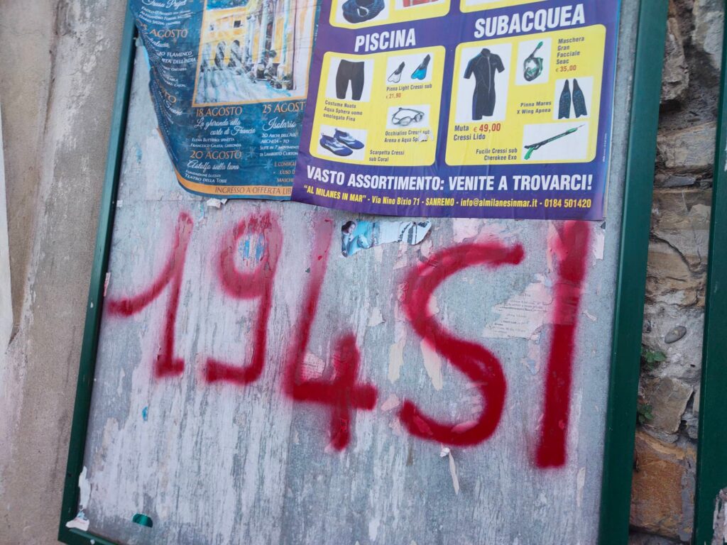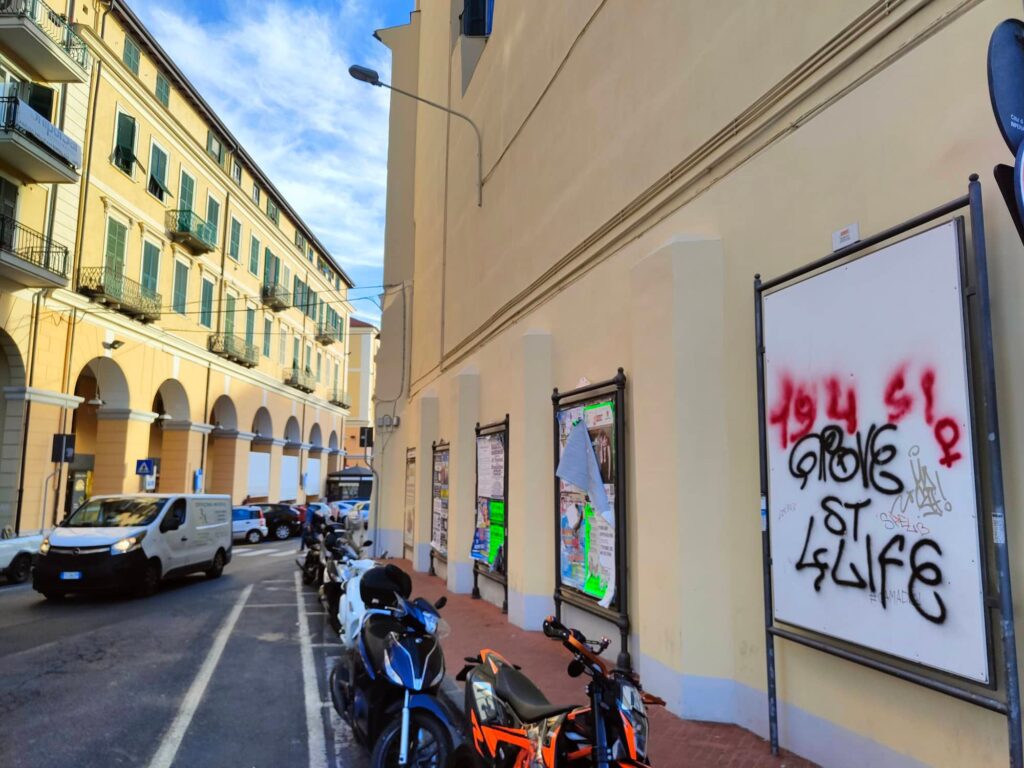 Le scritte sono comparse in diversi punti di Imperia come piazza Dante, Argine Sinistro, Lungomare Vespucci, via Pirinoli, sottopassaggio dell’ex stazione di Porto Maurizio, Borgo Prino, all’uscita dell’autostrada Imperia Ovest.