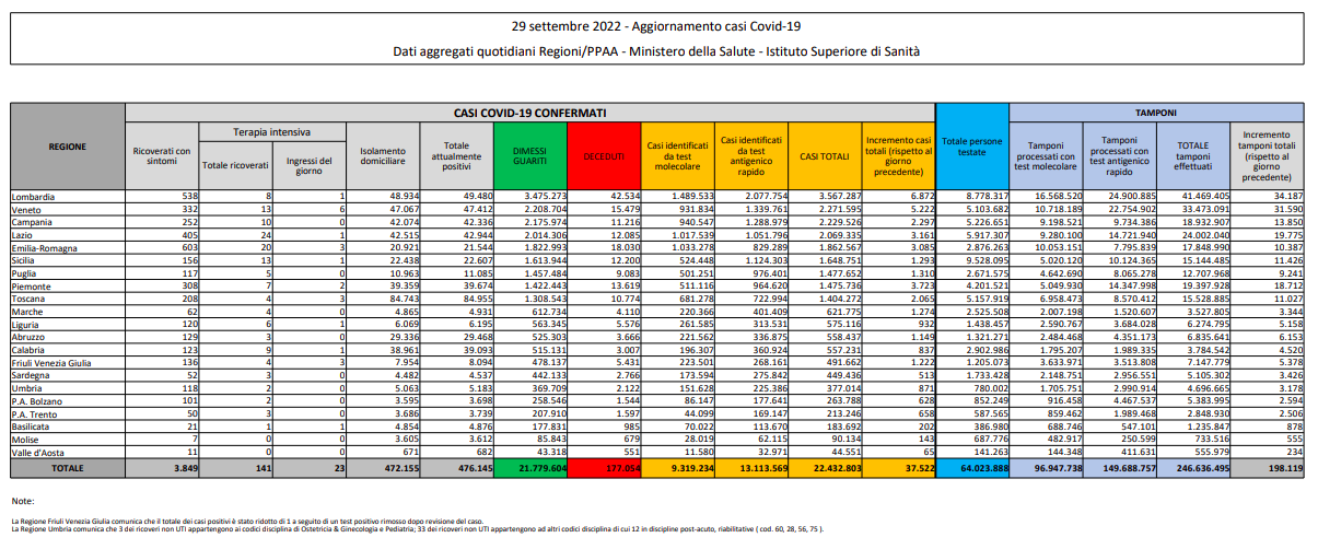 Sono 37.522 i nuovi casi di Coronavirus registrati su tutto il territorio nazionale, nell’arco delle ultime 24 ore (ieri 36.632).