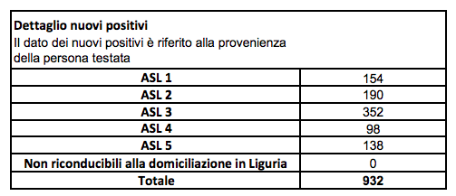 In Liguria i nuovi positivi sono 932 (ieri erano 921). Ecco il dettaglio dei nuovi positivi riferito alla residenza della persona testata: