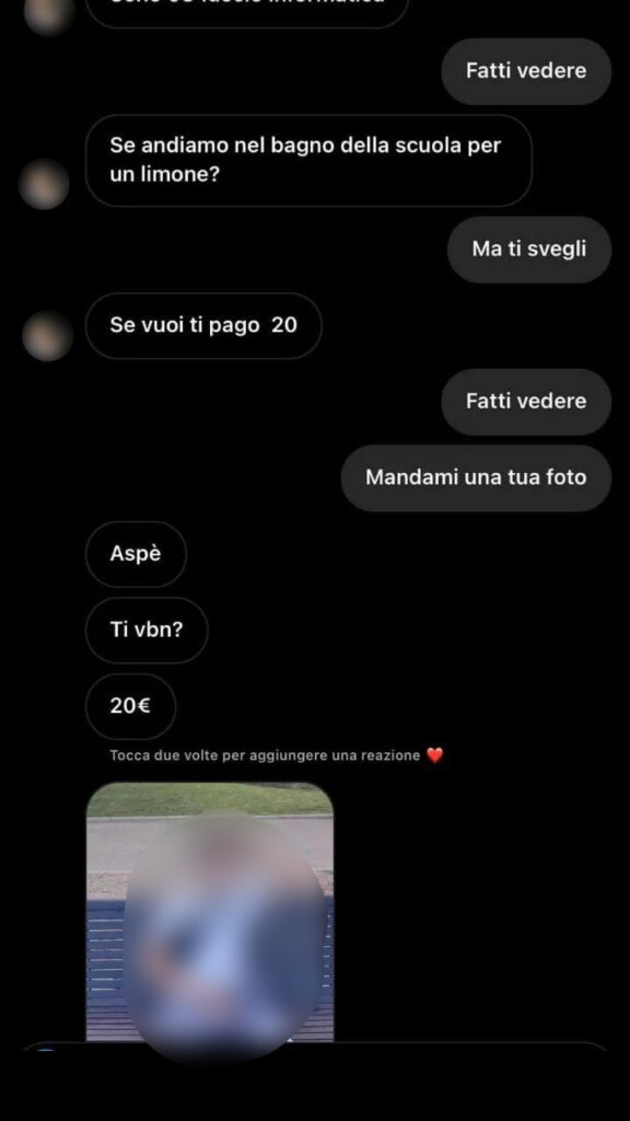 Nel dettaglio, secondo quanto riferito dalla famiglia, ignoti avrebbero usato delle fotografie del giovane per creare un falso profilo su Instagram e scrivere messaggi inopportuni a delle ragazze (“Mi mandi una foto del tuo c***?”, “Se andiamo nel bagno della scuola per un limone ti do 20 euro”) spacciandosi per lui.