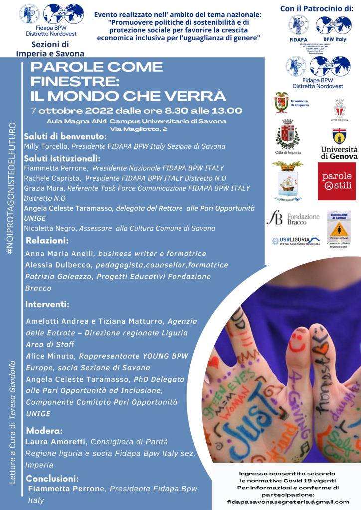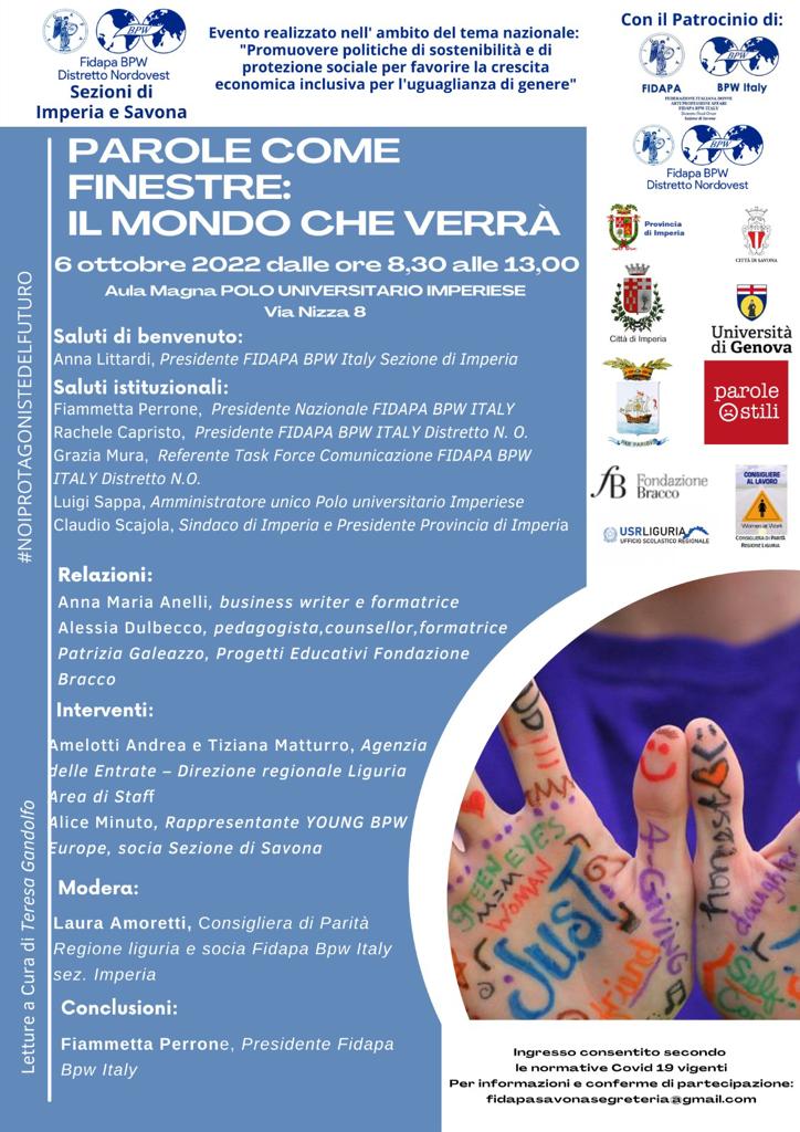 Si intitola “Le parole come finestre: il mondo che verrà” il convegno organizzato dalle sezioni di Imperia e Savona della Fidapa Bpw Italy che si svolgerà giovedì 6 e venerdì 7 ottobre 2022.