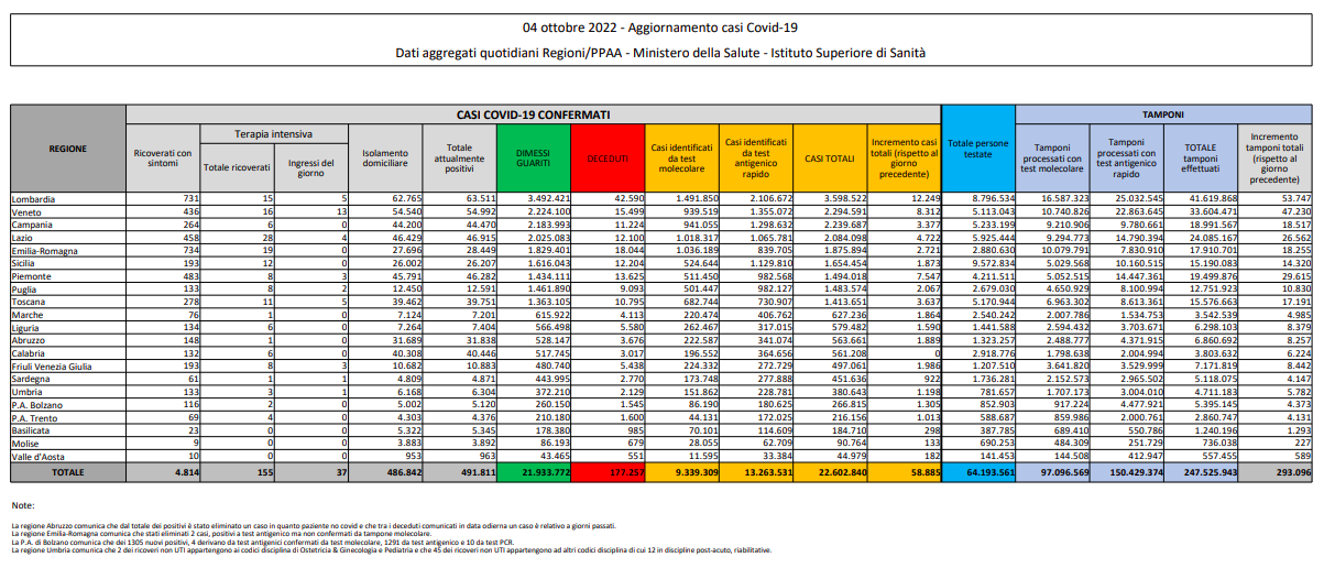Covid, Italia: il bollettino di martedì 4 ottobre