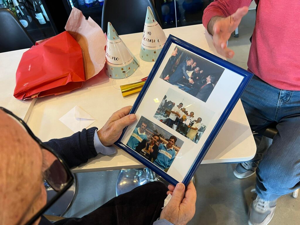 A Enzo sono stati consegnati diversi regali fra cui un quadro con alcune sue foto ai tempi della Maurina, che hanno risvegliato in lui ricordi felici.
