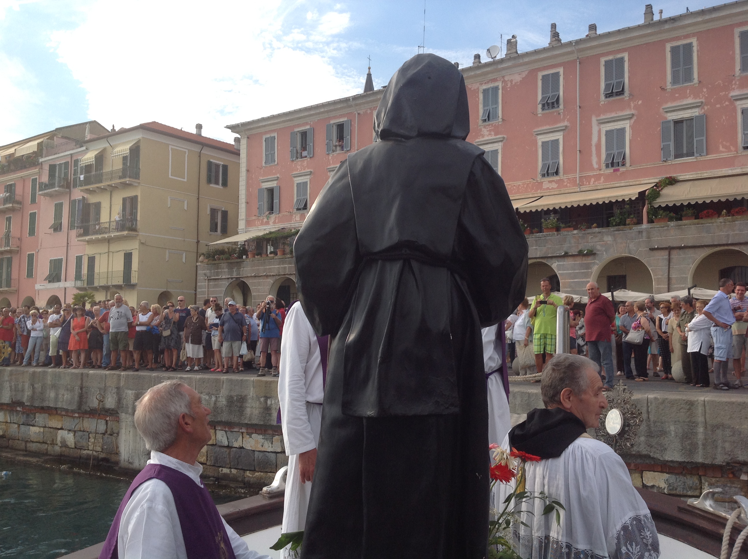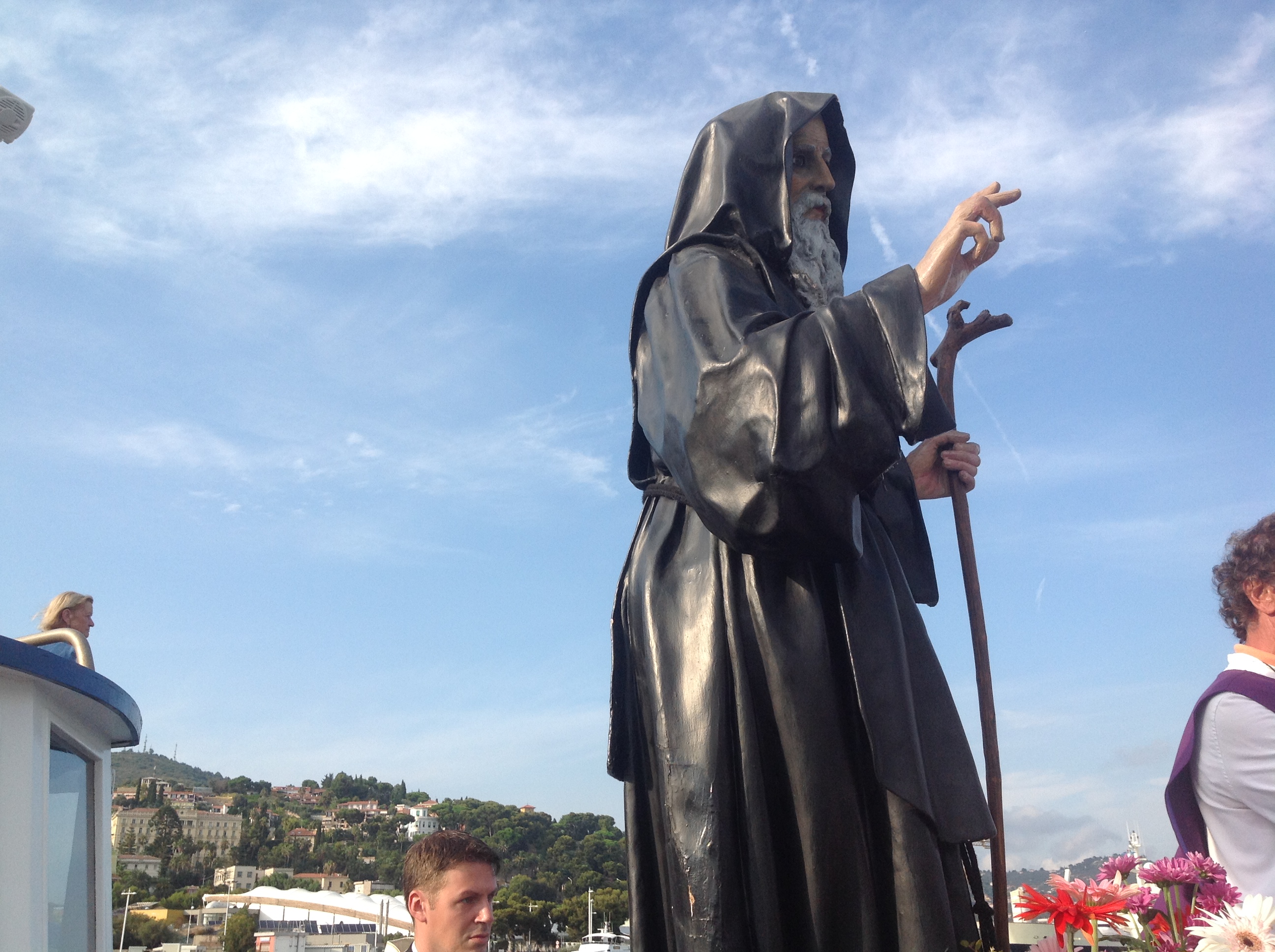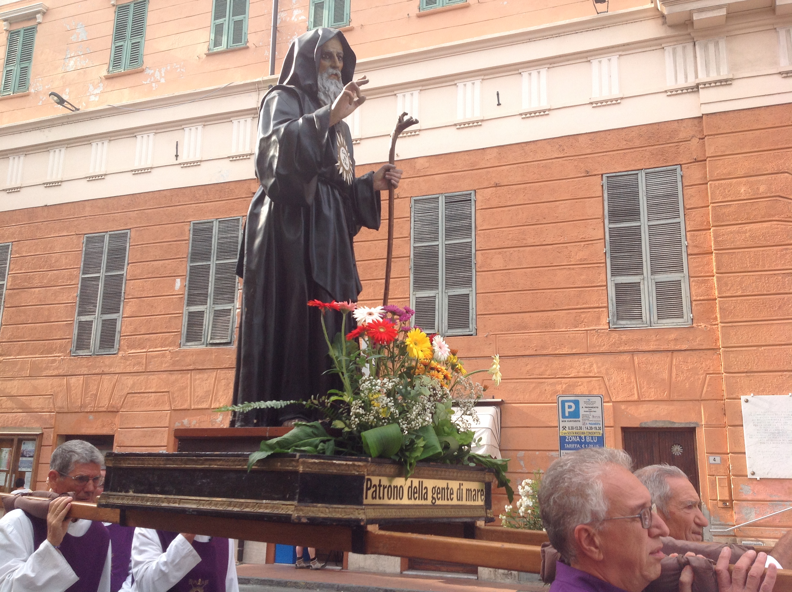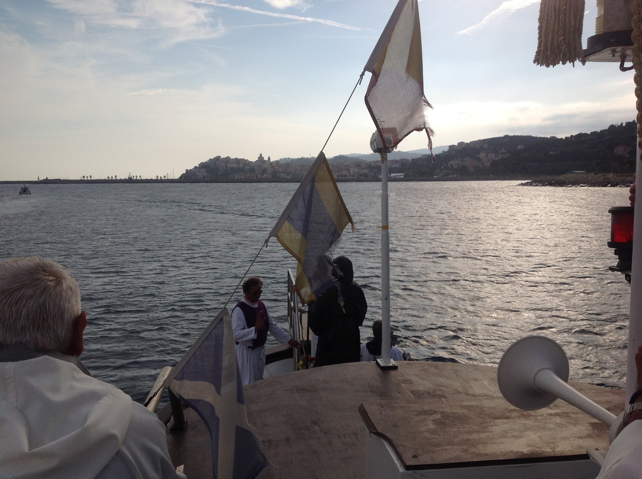 Arrivati su Calata Cuneo la statua in carton gesso del Santo è stata posizionata a bordo della Dea Diana e, subito dopo, la nave è salpata in direzione Borgo Marina. Qui si è fatta la consueta benedizione e, poco più al largo, davanti al Comune di Imperia, è stata lanciata in mare una corona d’alloro benedetta in onore dei caduti in mare. Dopo la benedizione della città la nave con il Santo è rientrata al porto di Oneglia.