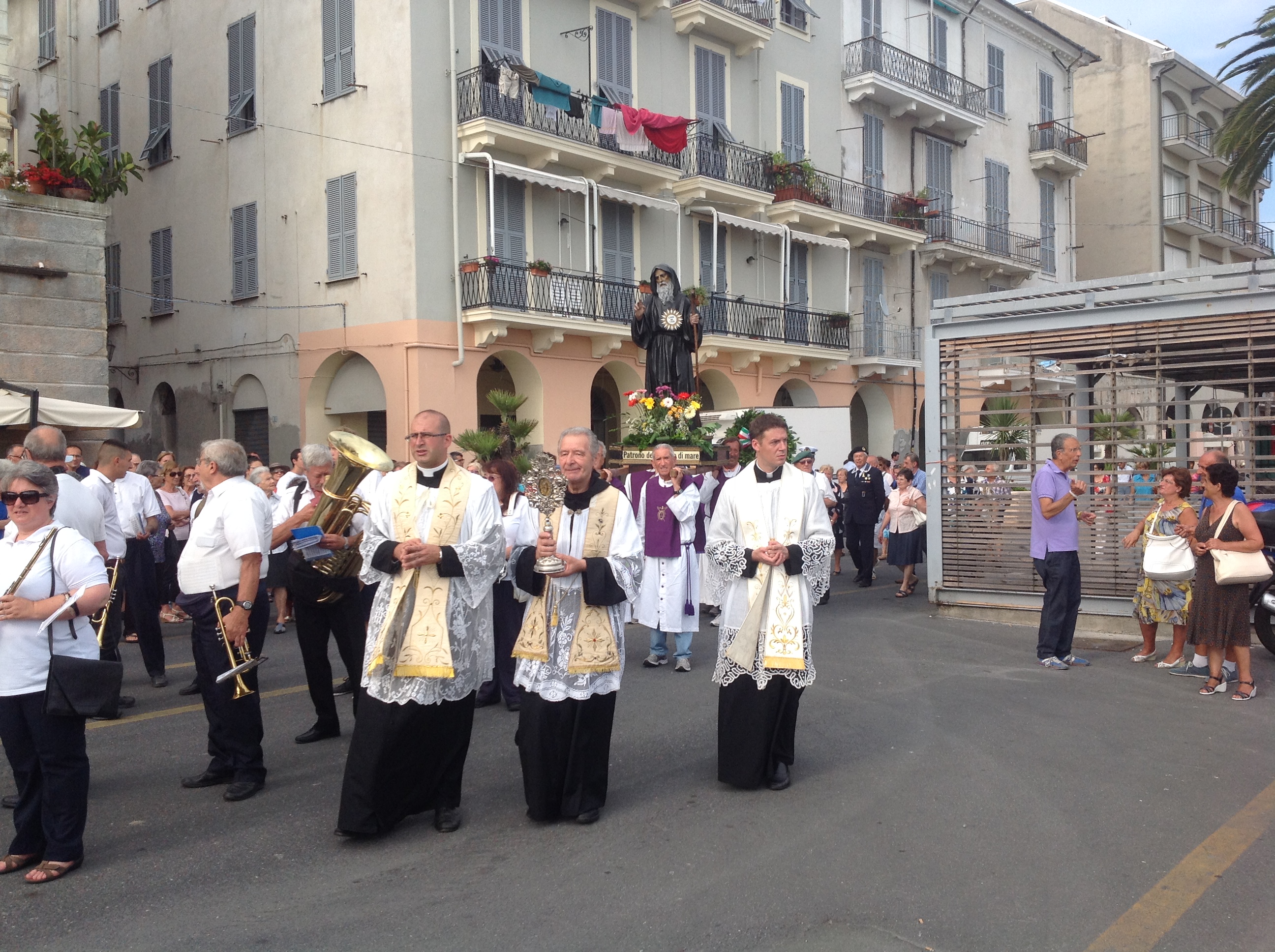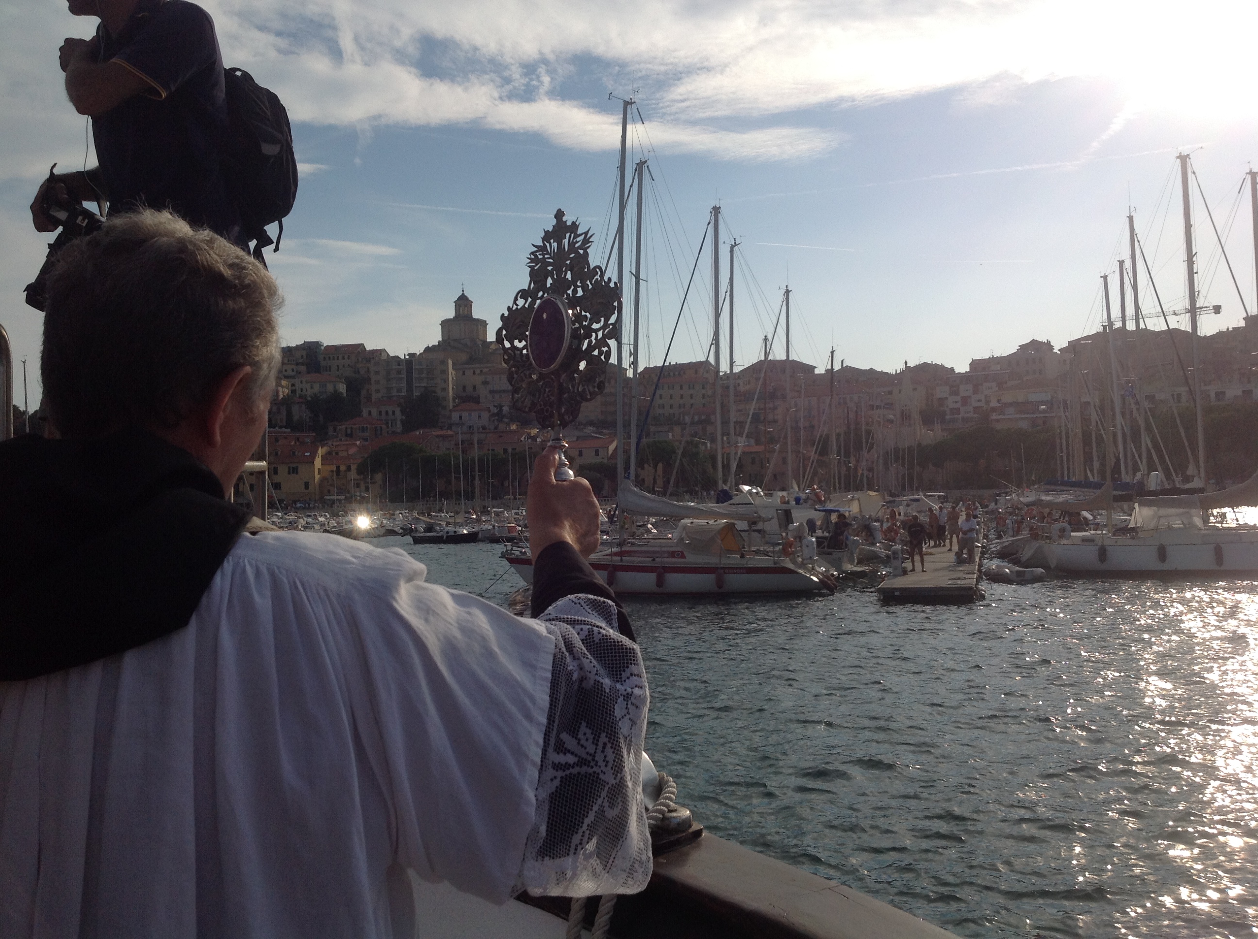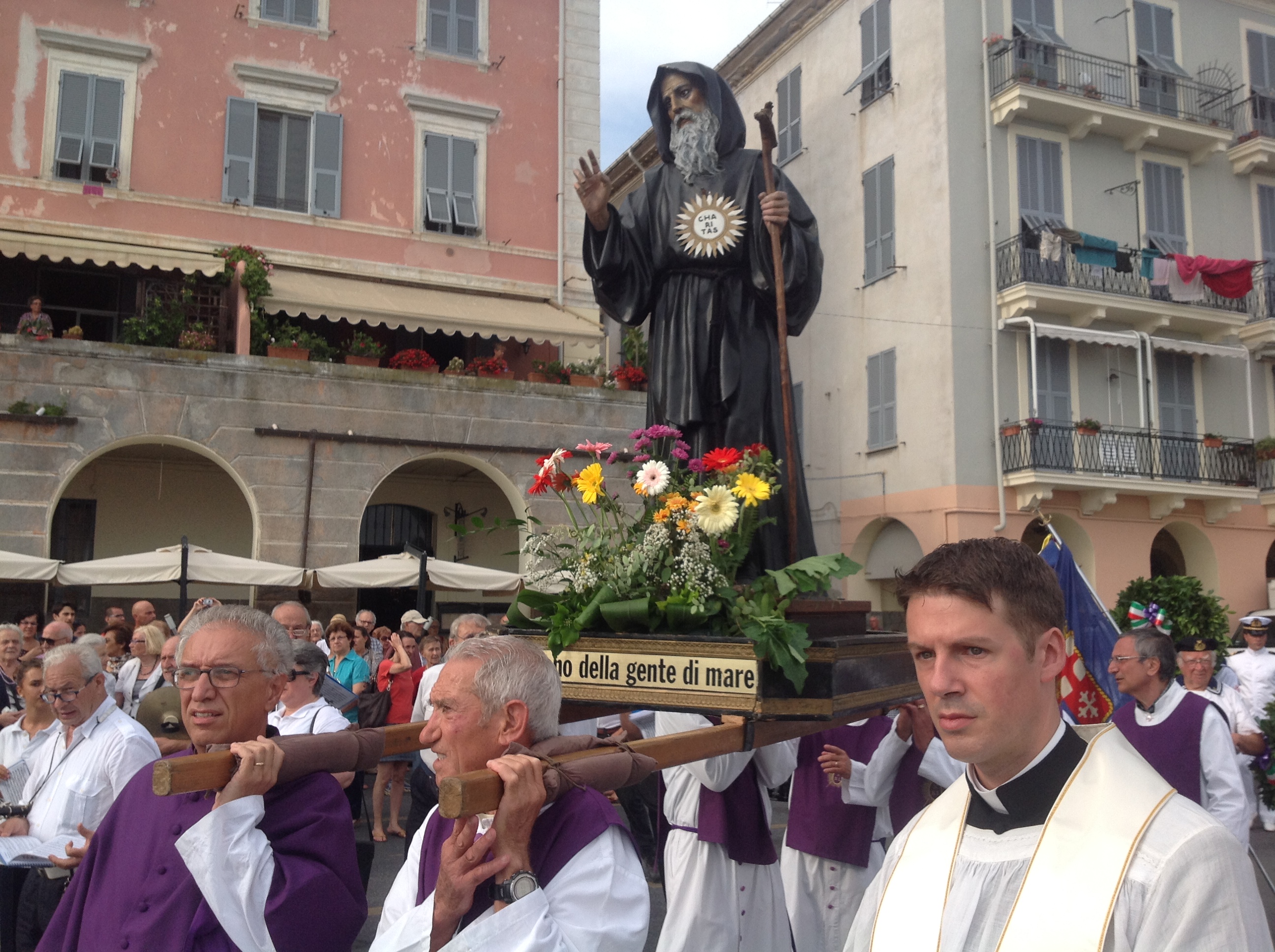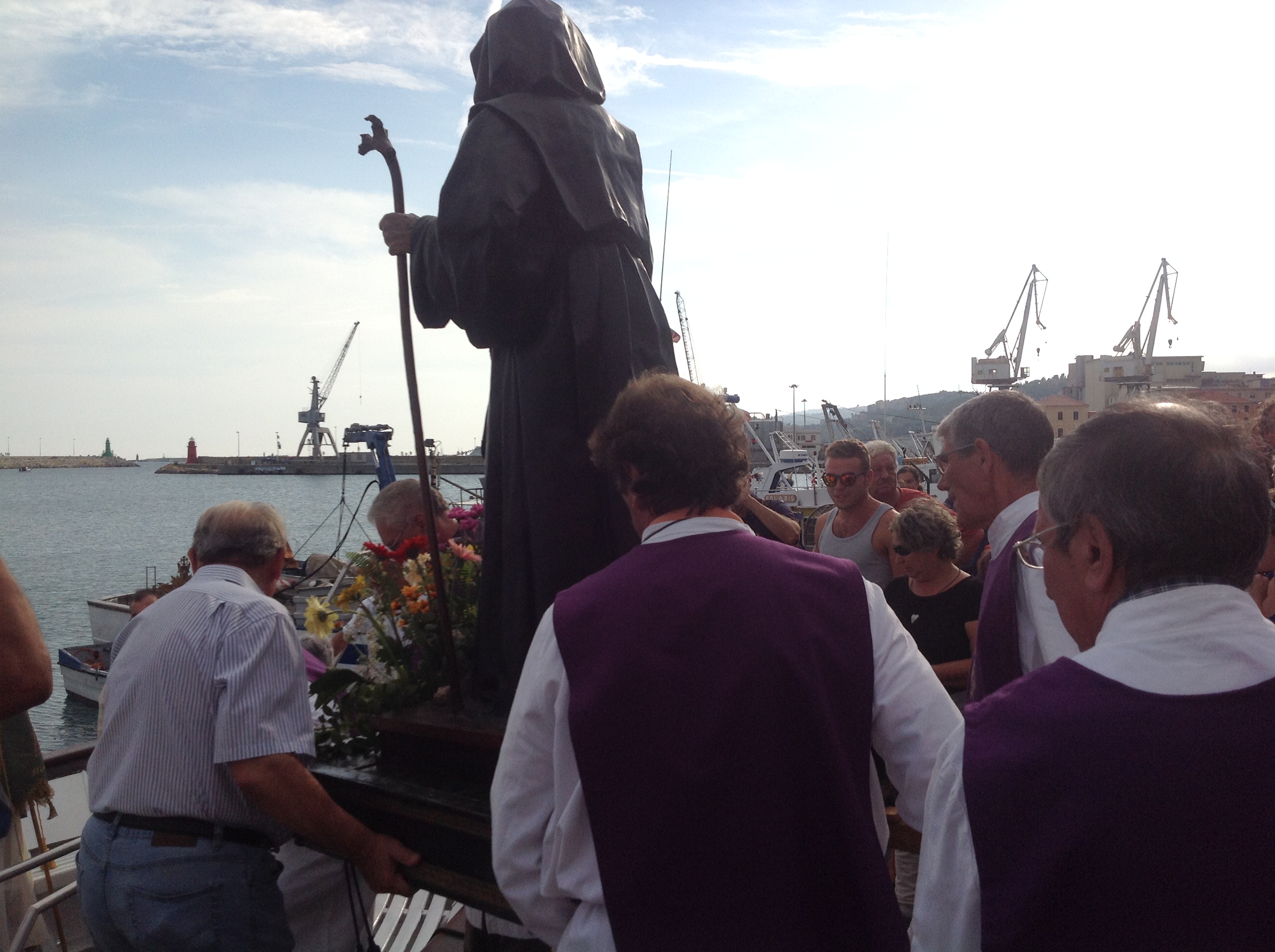 Arrivati su Calata Cuneo la statua in carton gesso del Santo è stata posizionata a bordo della Dea Diana e, subito dopo, la nave è salpata in direzione Borgo Marina. Qui si è fatta la consueta benedizione e, poco più al largo, davanti al Comune di Imperia, è stata lanciata in mare una corona d’alloro benedetta in onore dei caduti in mare. Dopo la benedizione della città la nave con il Santo è rientrata al porto di Oneglia.