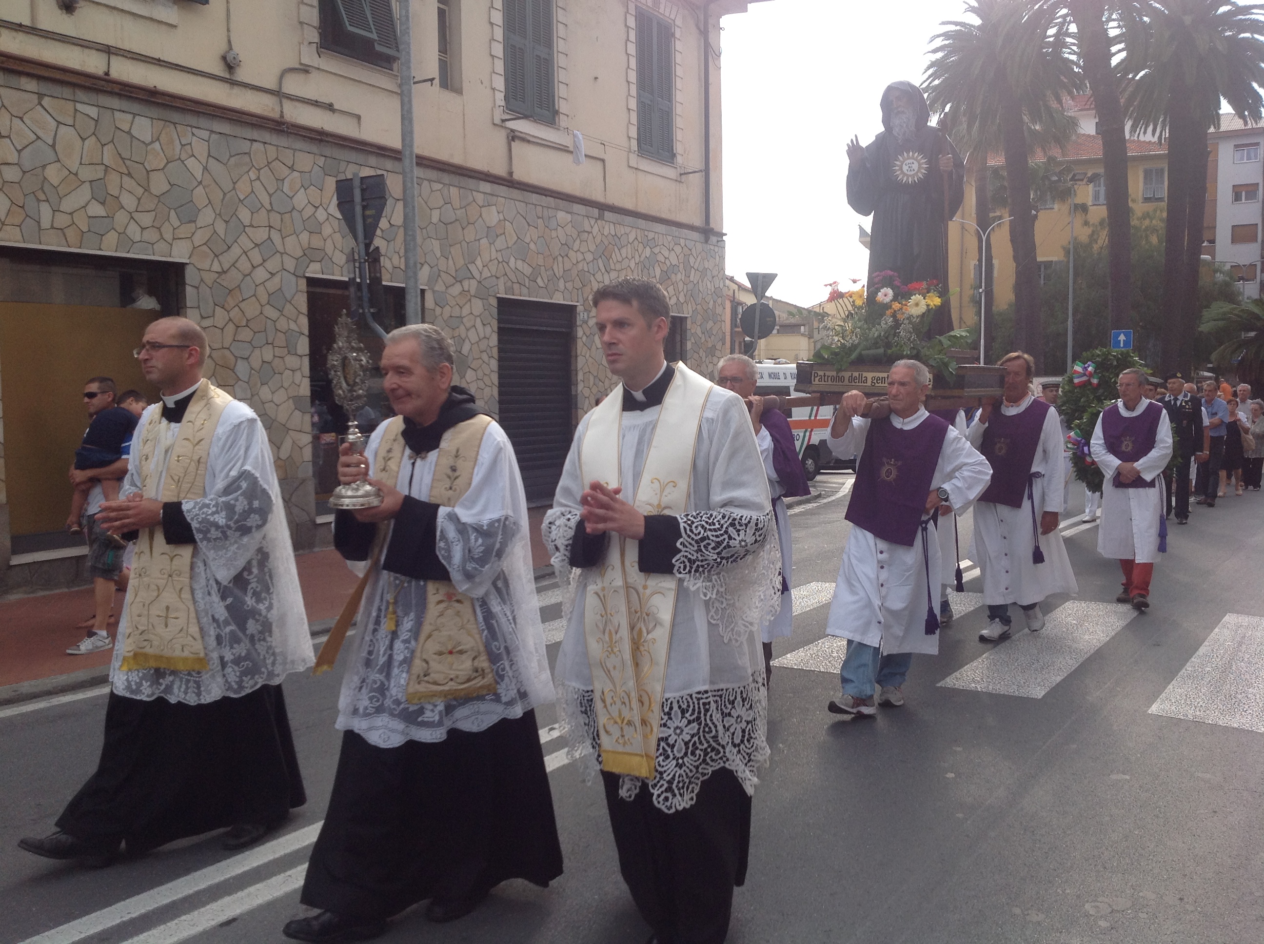 Imperia. Si è svolta questo pomeriggio, alle 18, la tradizionale processione con partenza da Piazza Ulisse Calvi dalla Chiesa di Ss.Annunziata che ha visto sfilare tra le vie cittadine il Patrono della Gente di Mare, San Francesco da Paola.