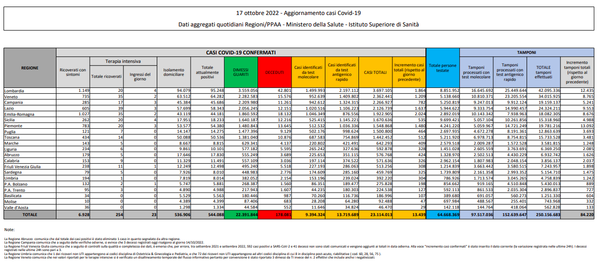 Covid, Italia: il bollettino di lunedì 17 ottobre