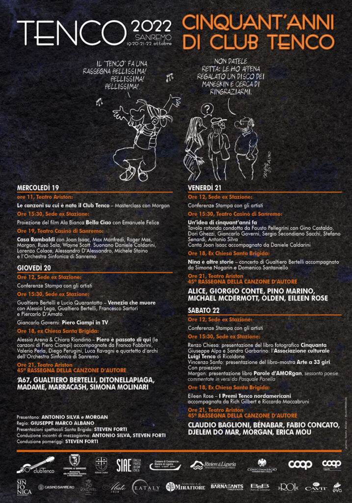 “Il Tenco si arricchisce sempre di più attività collaterali che si svolgeranno in bellissime location, come la sede del Tenco alla vecchia stazione, la ex Chiesa di Santa Brigida e il Teatro Casinò di Sanremo, e che accompagneranno il programma delle serate al Teatro Ariston.