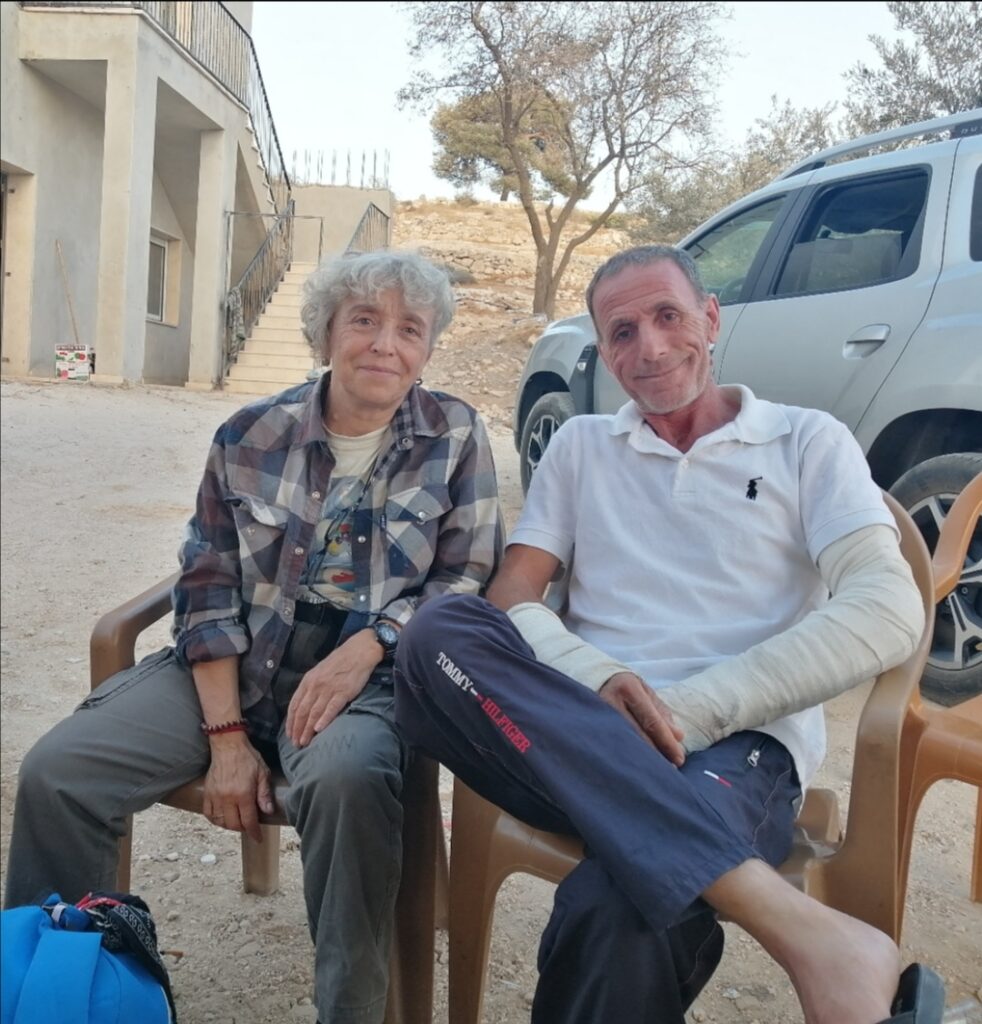 Il 12 settembre Hafez, con suo figlio di 18 anni, stava coltivando il suo orto vicino a casa quando 5 coloni armati di bastoni di ferro, pistole e un M16, lo ha assalito fratturandogli entrambe le braccia e una mano. Lui, in extremis, ha lanciato l’attrezzo con il quale lavorava la terra colpendo di striscio uno di loro. Per fortuna l’arrivo della gente del villaggio e dei soldati ha fermato gli assalitori. Decisione dell’esercito: arresto di Hafez (con le braccia rotte) con accusa di tentato omicidio, mentre i coloni se ne sono tornati a casa impuniti. Se non vi fosse stato un inequivocabile video di 23 minuti, Hafez rischierebbe l’ergastolo… Non solo: uno degli assalitori ha squarciato le gomme dell’ambulanza palestinese sotto lo sguardo consenziente dei soldati… Questa è la giustizia di Israele.
