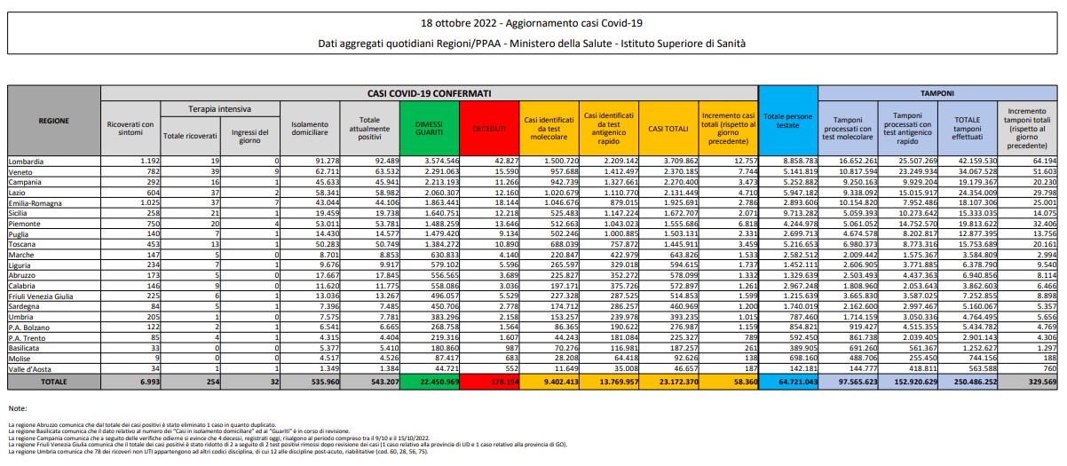 Covid, Italia: il bollettino di martedì 18 ottobre