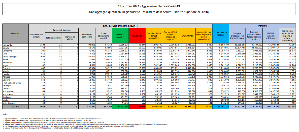 Covid, Italia: il bollettino di mercoledì 19 ottobre