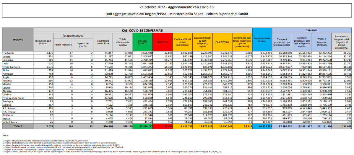 Covid, Italia: il bollettino di venerdì 21 ottobre
