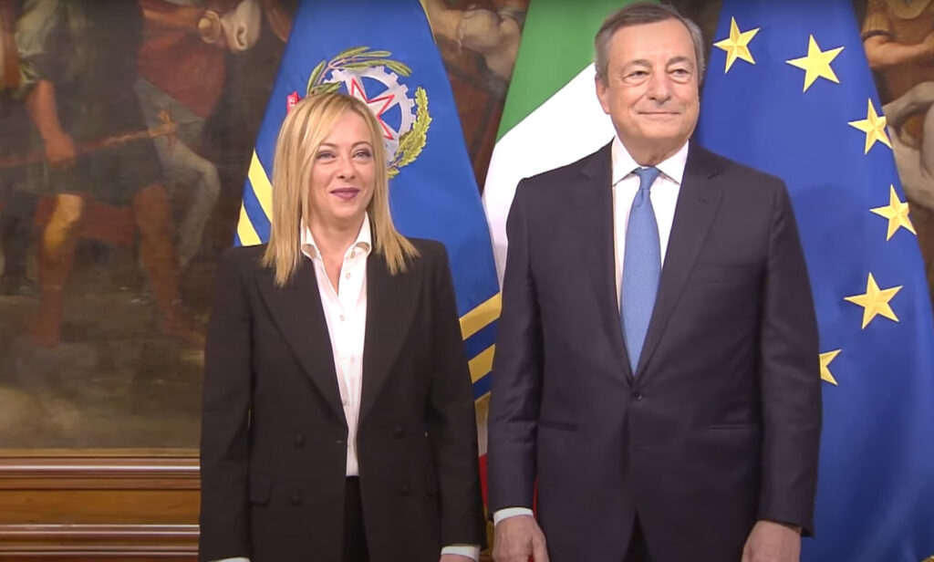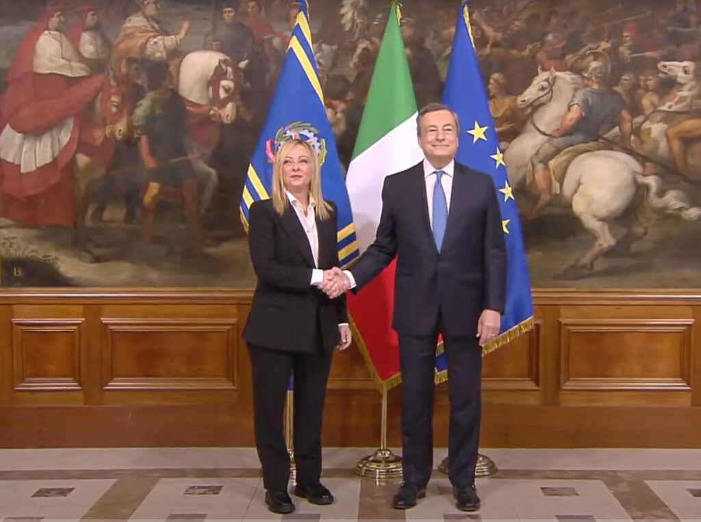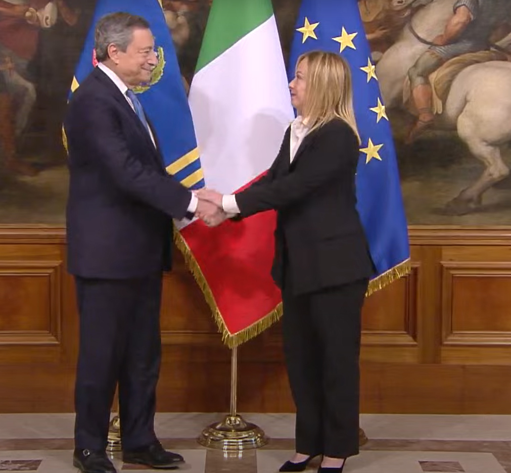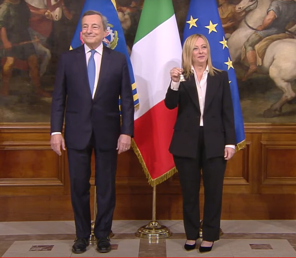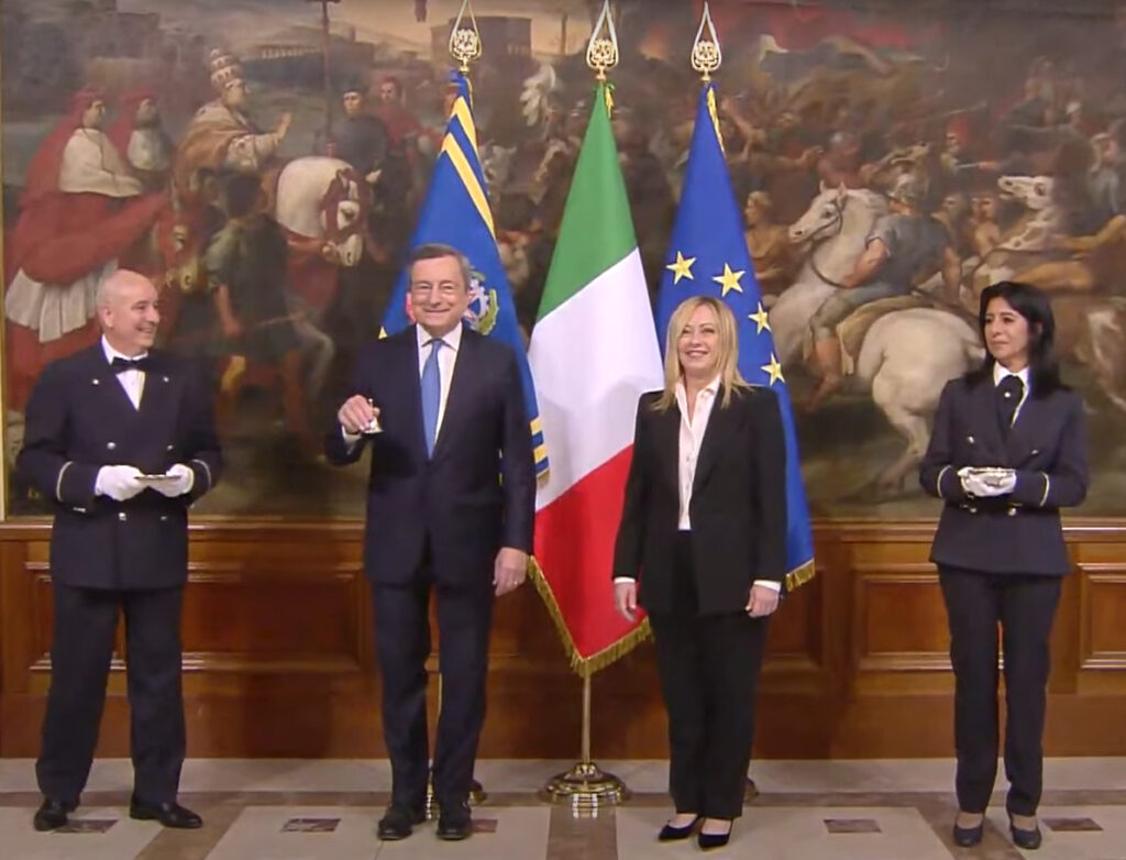 Si è svolta intorno a mezzogiorno, oggi, la tradizionale cerimonia del passaggio della campanella fra il Presidente del Consiglio uscente Mario Draghi e il nuovo Premier Giorgia Meloni, prima donna nella storia della Repubblica a presiedere il Consiglio dei ministri.