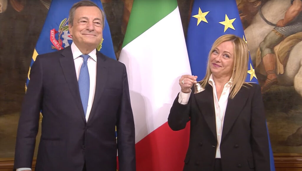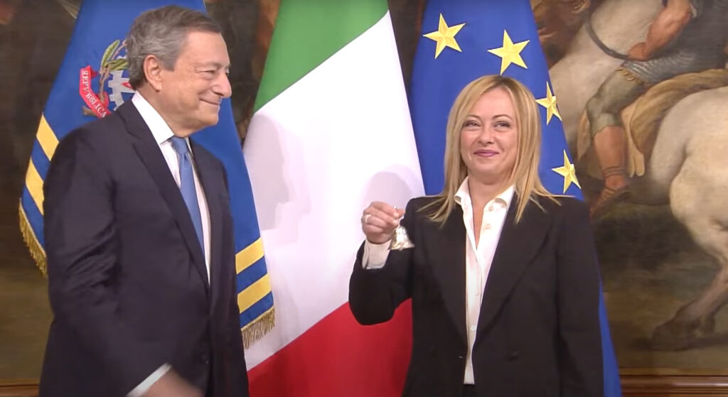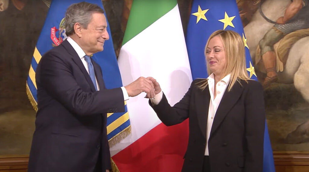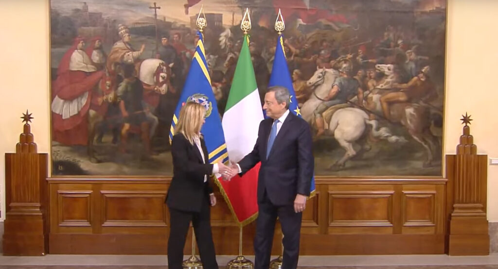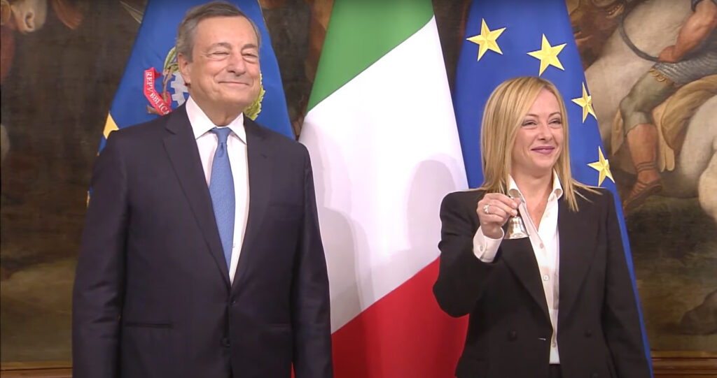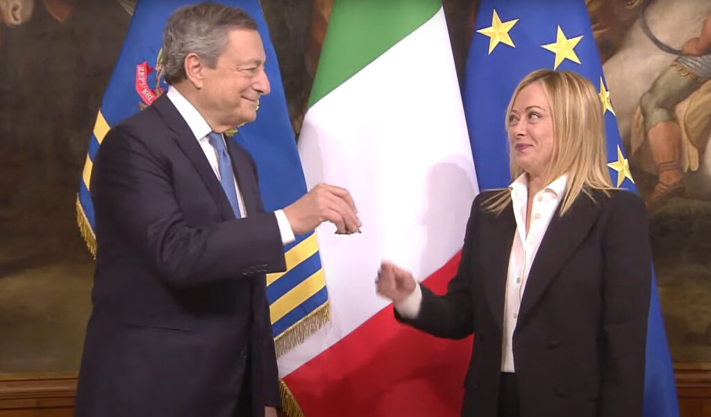 Si è svolta intorno a mezzogiorno, oggi, la tradizionale cerimonia del passaggio della campanella fra il Presidente del Consiglio uscente Mario Draghi e il nuovo Premier Giorgia Meloni, prima donna nella storia della Repubblica a presiedere il Consiglio dei ministri.