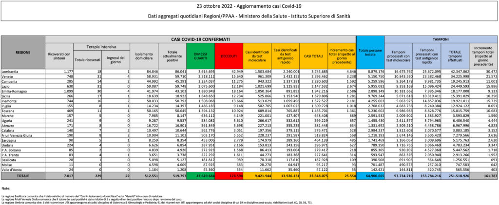 I pazienti Covid in terapia intensiva sono in totale 229, con 22 nuovi ingressi, mentre nei reparti ordinari sono 7.017 (-30). L’occupazione degli ospedali continua ad essere sotto controllo e i reparti non sono sotto pressione.