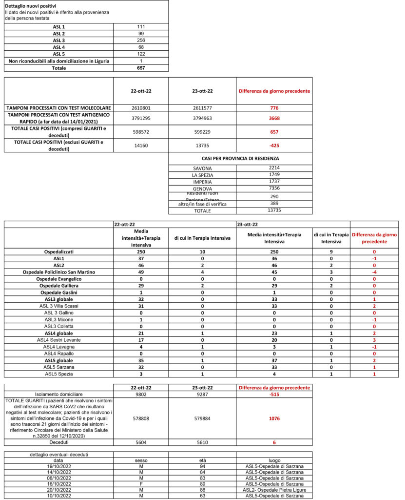 Sono 657 i novi positivi al Covid nelle ultime 24 ore in Liguria, di cui 111 nella provincia di Imperia. Sei i decessi di anziani in regione, ma riferiti a più giorni precedenti. Lo evidenzia il bollettino di oggi con i dati di flusso Alisa – Ministero della Salute.