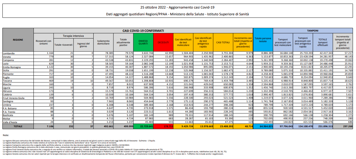 Covid, Italia: il bollettino di martedì 25 ottobre