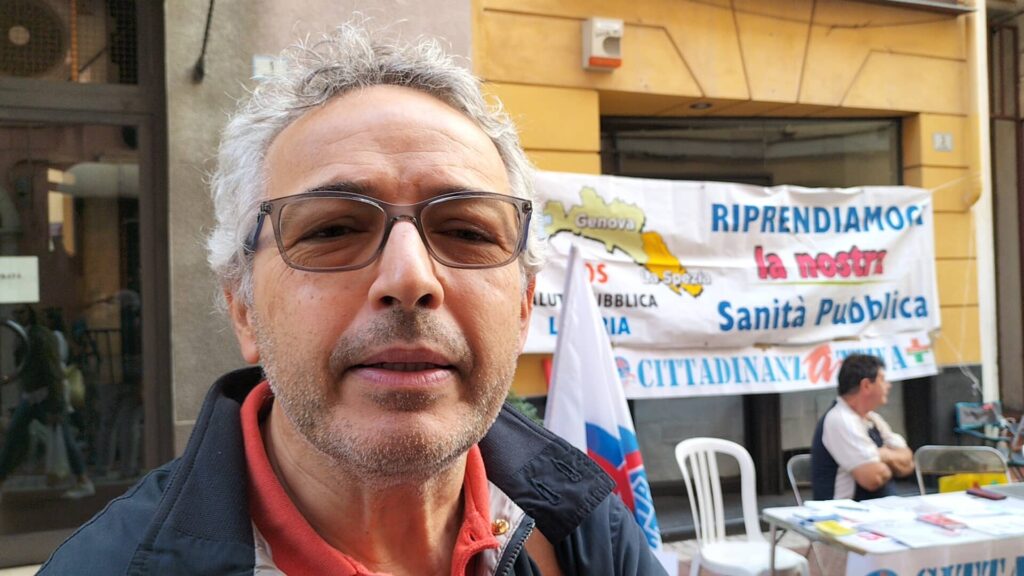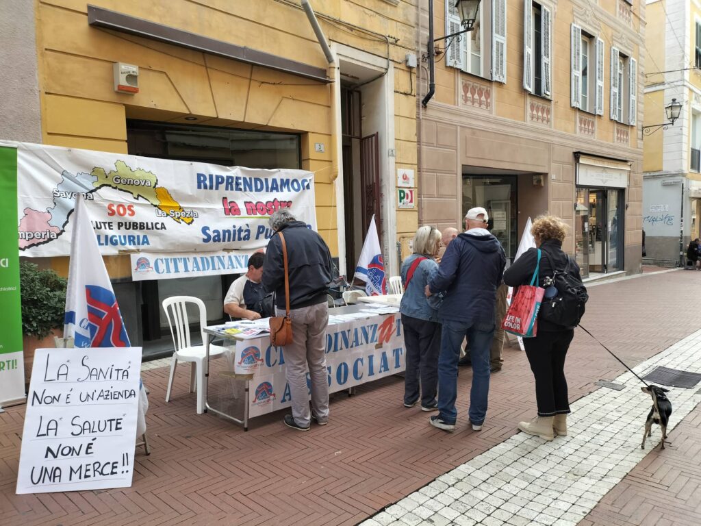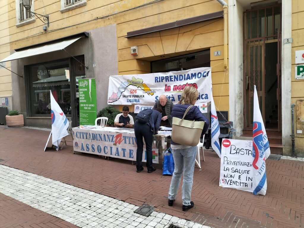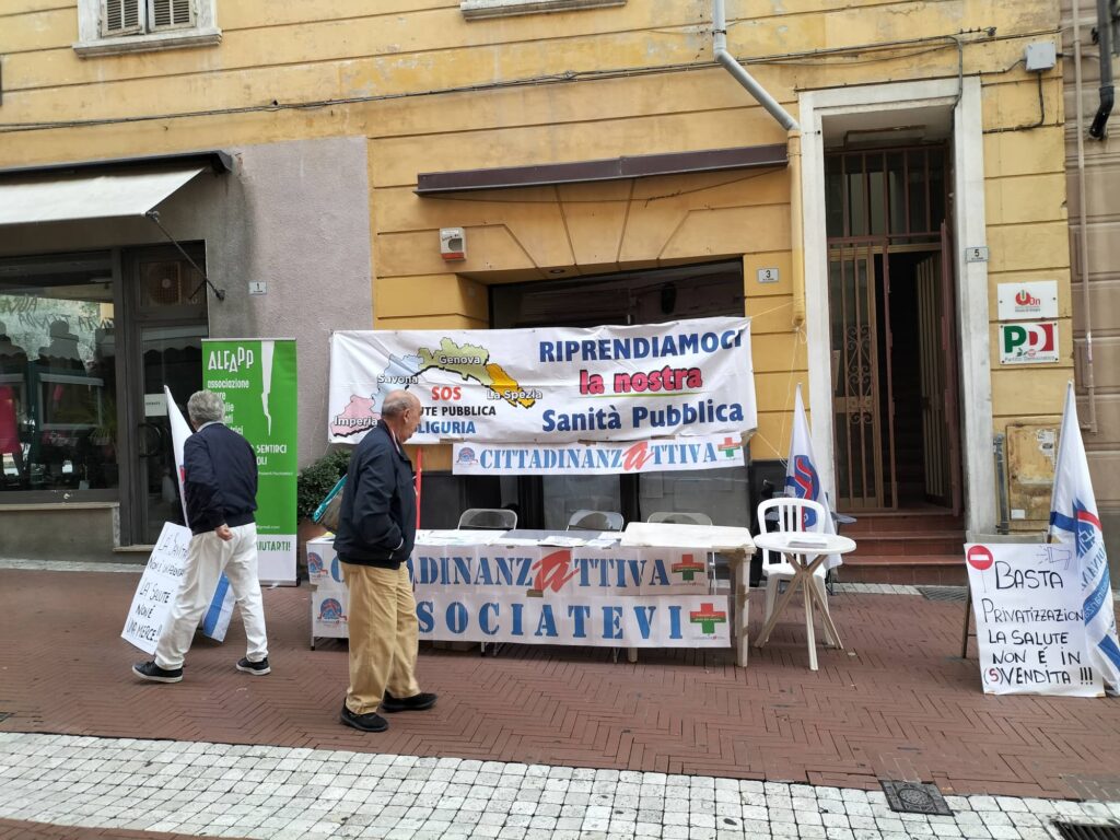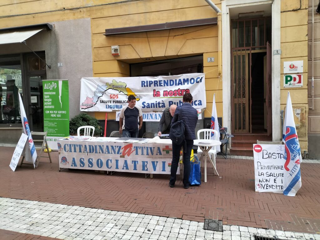 Presidio contro la privatizzazione della sanità pubblica in Liguria e nello specifico sulla provincia di Imperia, questa mattina, mercoledì 26 ottobre, in via San Giovanni. Presenti Valentino Ballerini, nuovo coordinatore di Cittadinanzattiva e Paolo Curti, vicepresidente di Alfapp (Associazione Ligure Famiglie Pazienti Psichiatrici).