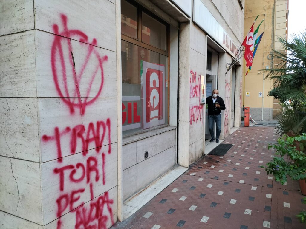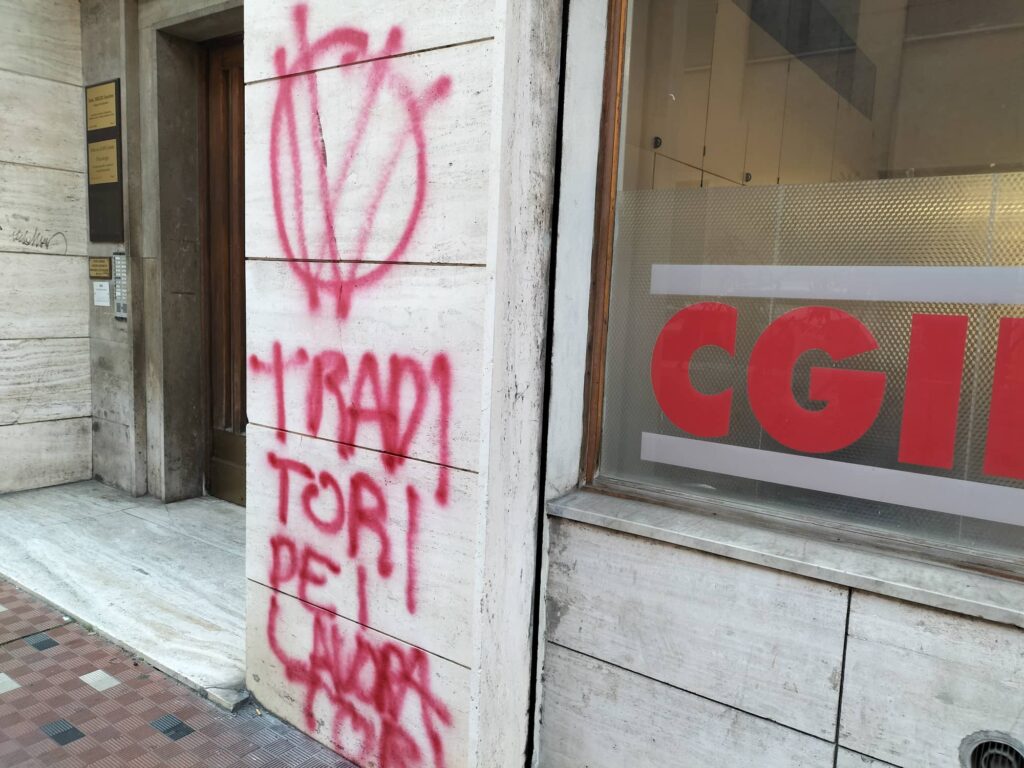 “Traditori dei lavoratori. Sindacati Nazisti” – Queste alcune delle scritte che capeggiano sui muri della sede di via De Sonnaz.