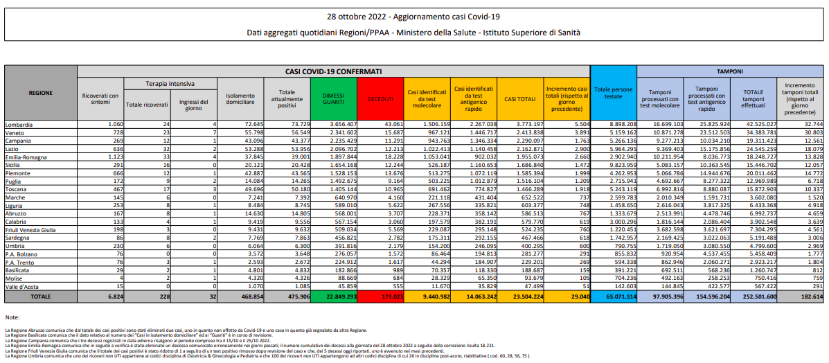 Covid, Italia: il bollettino di venerdì 28 ottobre