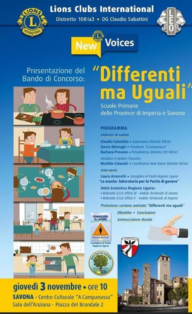 Il comitato New Voices del Distretto Lions 108 Ia3 in collaborazione con la consigliera effettiva di parità della Regione Liguria Laura Amoretti e la supplente Irene Mercuri le quali nella splendida cornice della sala dell’anziani della Campanassa, hanno sottoscritto il bando di concorso “differenti ma uguali” promosso dai Distretti Lions e Leo. Sono intervenuti Claudio Sabattini, Governatore del distretto Lions 108 Ia3, Giampiero Storti Vicepresidente Vicario dell ‘Associazione ” A campanassa”, Laura Amoretti Consigliera di parità effettiva e la supplente Irene Mercuri , Laura Barberis USR Liguria ambito territoriale di Savona, Nadia Rossello referente per l’ inclusione istituto Savona 1 Don Gallo.
