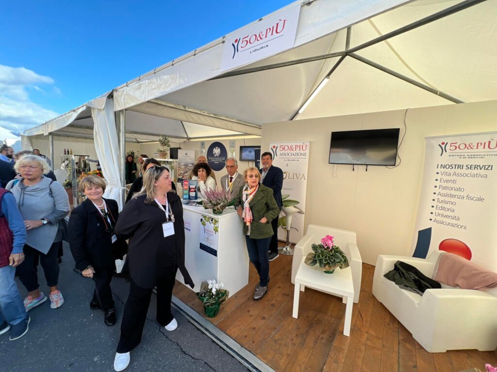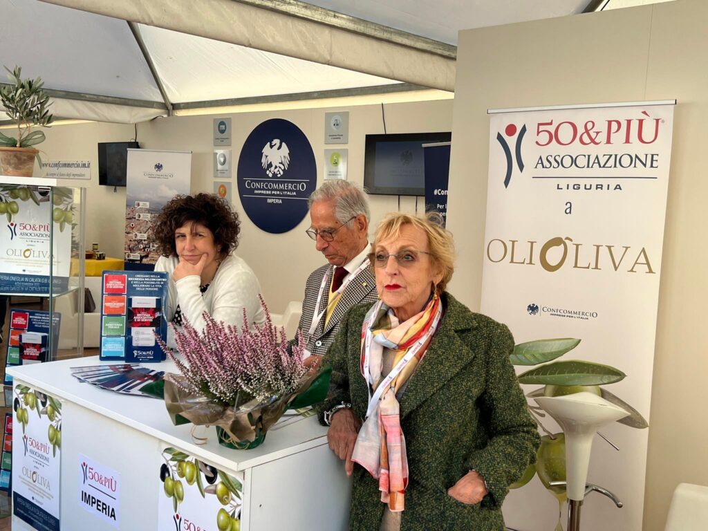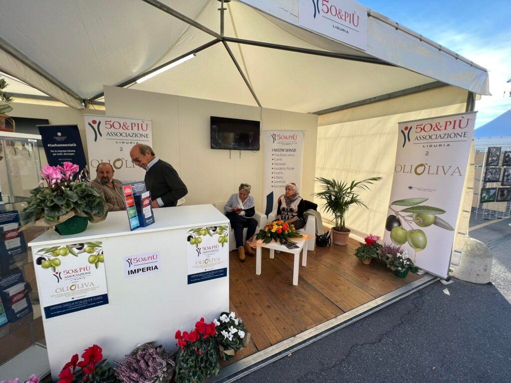 In Calata Cuneo, fra gli stand di Olioliva, c’è anche quello dell’Associazione 50&Più, nata sotto l’ombrello di Confcommercio e che si è poi sviluppata, realizzando servizi di patronato e assistenza fiscale.