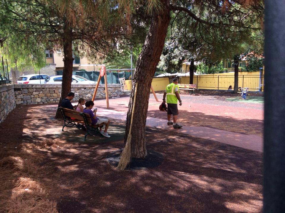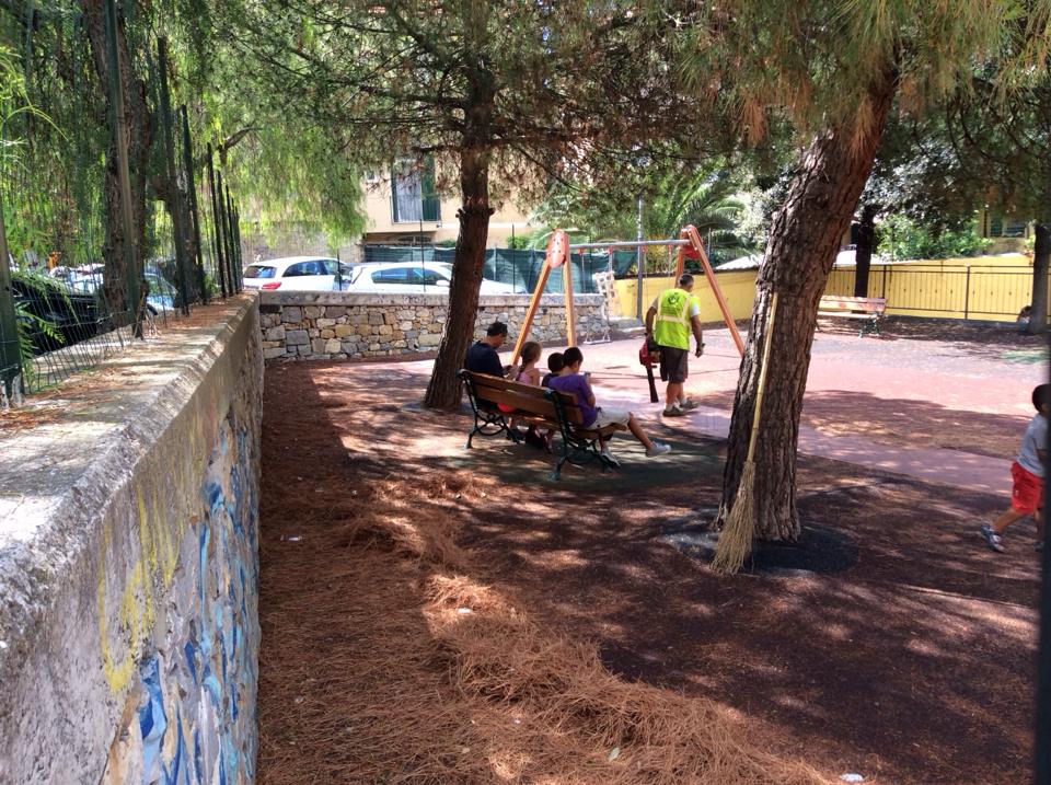 Imperia. Dopo svariate segnalazioni da parte dei lettori ad Imperiapost e agli organi competenti, gli operai del Comune di Imperia si sono messi a lavoro questa mattina per ripulire il parco giochi di Largo Ghiglia.