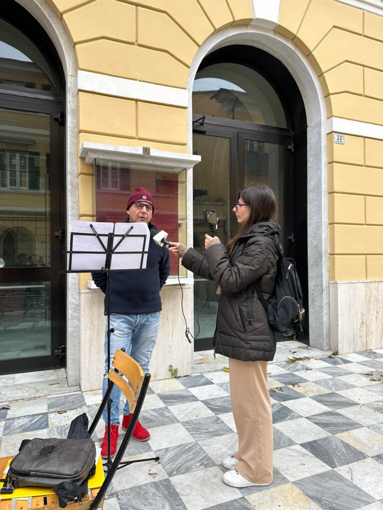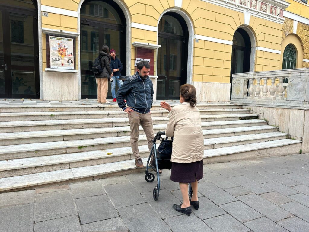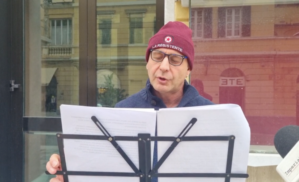 Durante il tempo che abbiamo trascorso davanti allo storico Teatro imperiese, chiuso dal lontano 2015 (qui tutta la cronistoria), Donati ha recitato alcuni monologhi in occasione della Giornata contro la violenza sulle donne e in onore di Felice Cascione, per rendere omaggio al partigiano imperiese che dà il nome alla via centrale di Porto Maurizio.