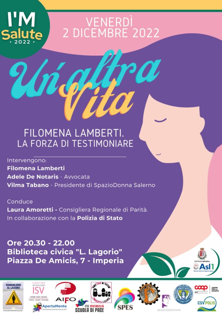 Gli incontri, dal titolo “UN’ALTRA VITA – Filomena Lamberti, la forza di testimoniare“, per il loro alto valore morale e di coscientizzazione sono stati accolti nell’ambito degli eventi organizzati dall’ASL1 e dal Comune di Imperia: “I’m Salute” che si svolgono dal 30 novembre al 4 dicembre.