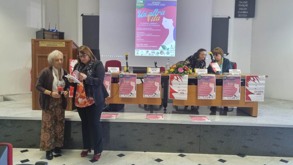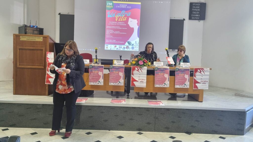Gli incontri, dal titolo “UN’ALTRA VITA – Filomena Lamberti, la forza di testimoniare”, per il loro alto valore morale e di coscientizzazione sono stati accolti nell’ambito degli eventi organizzati dall’ASL1 e dal Comune di Imperia: “I’m Salute” che si svolgono dal 30 novembre al 4 dicembre.