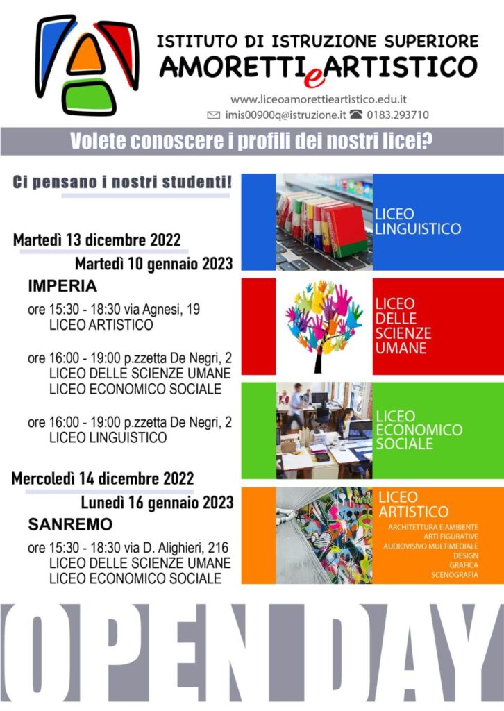 • sede di Imperia – 13 dicembre, dalle ore 16 alle ore 19, per Liceo delle Scienze Umane, Les e Linguistico; per il Liceo Artistico invece dalle 15,30 alle 18,30.