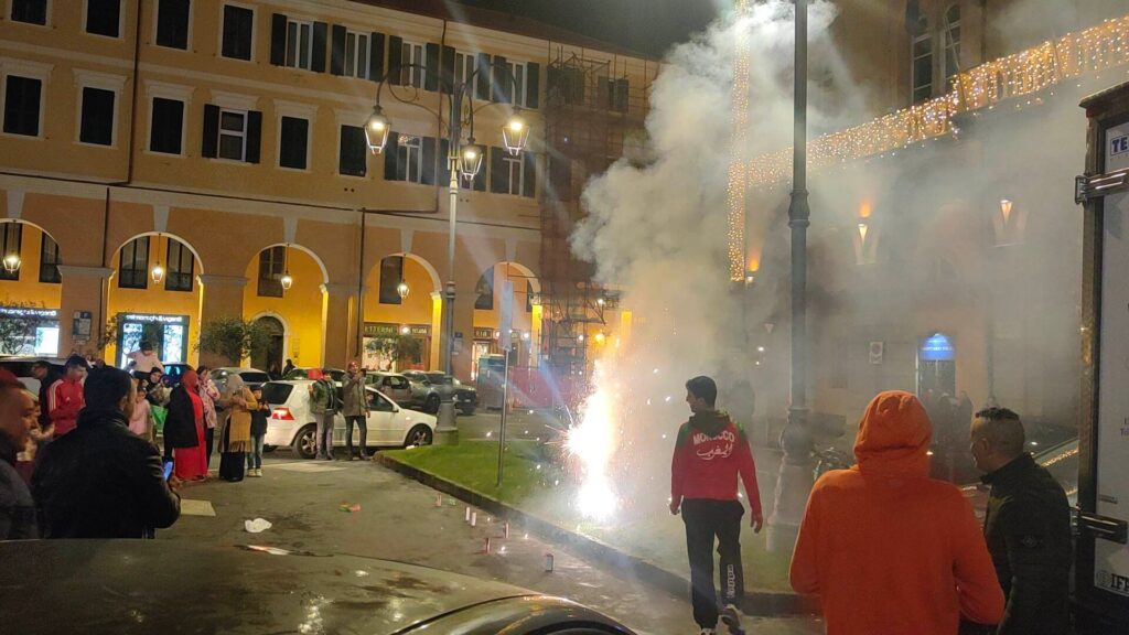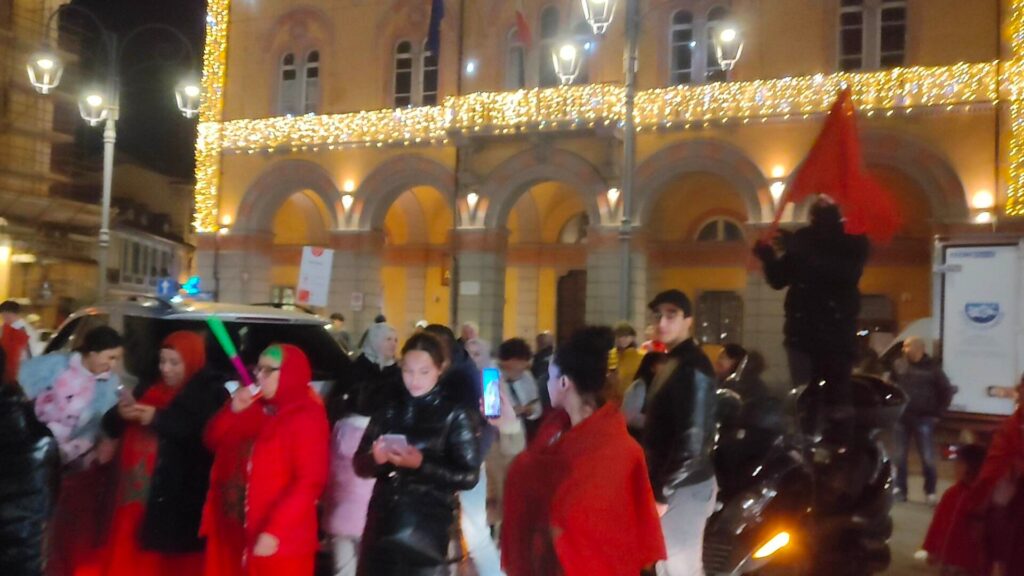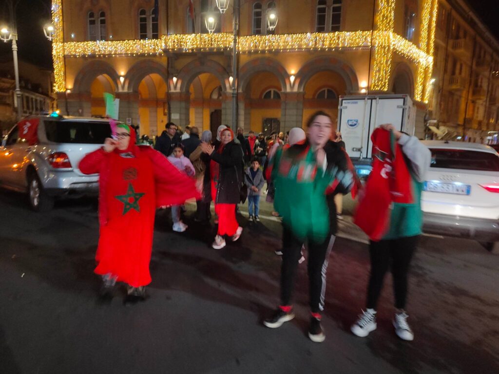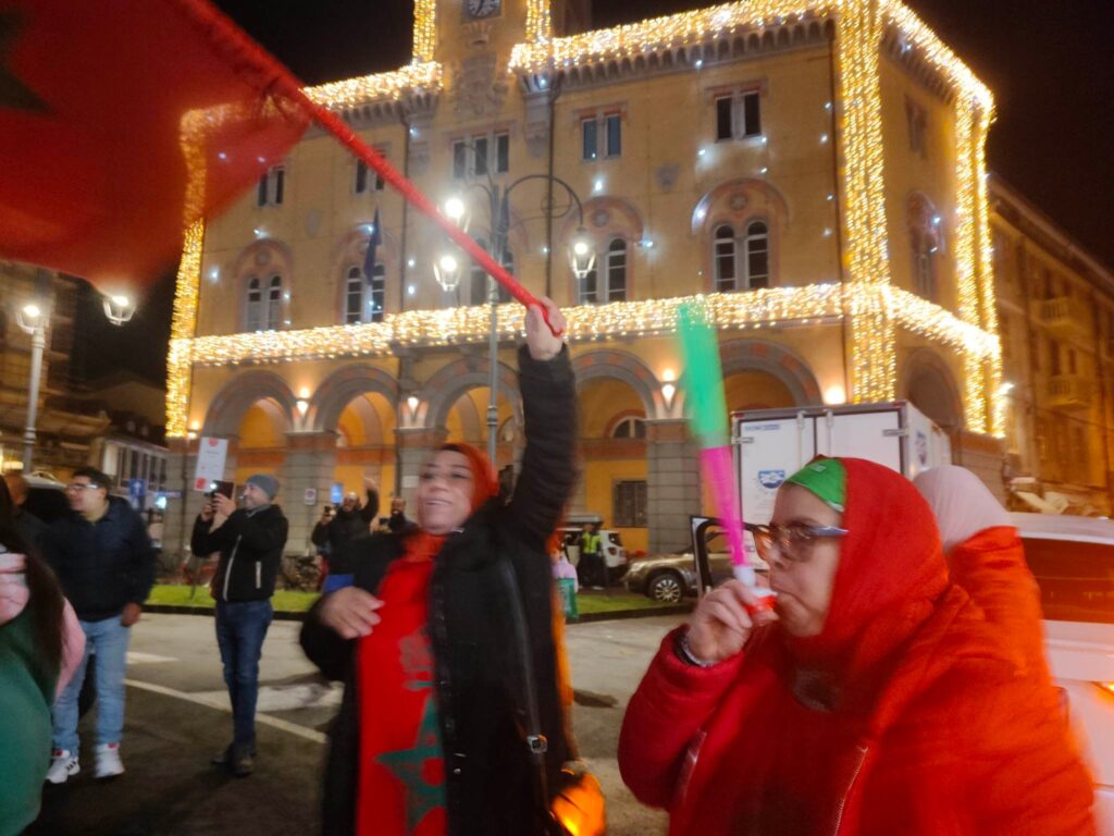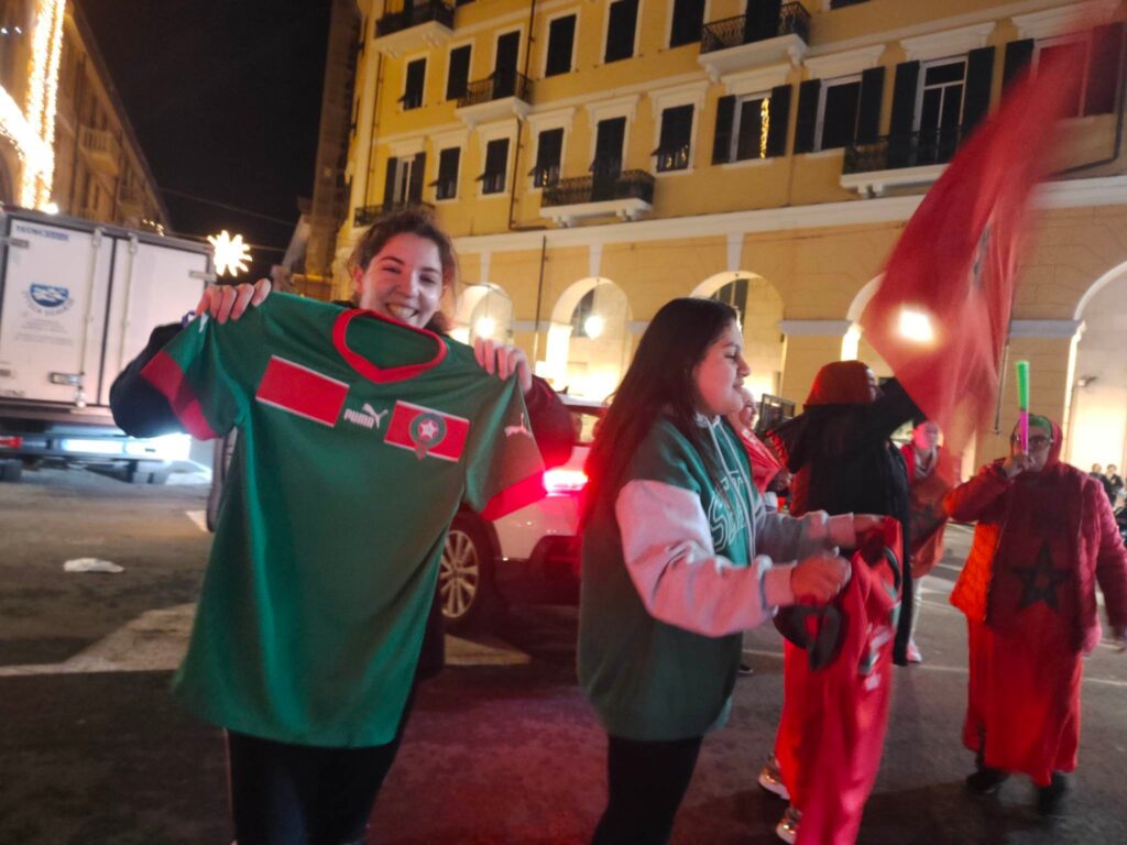 Grande festa anche a Imperia, in piazza Dante, per la vittoria del Marocco, 1-0 contro il Portogallo, che ha permesso alla nazionale nordafricana di conquistare le semifinali nei mondiali di calcio in corso in Qatar.