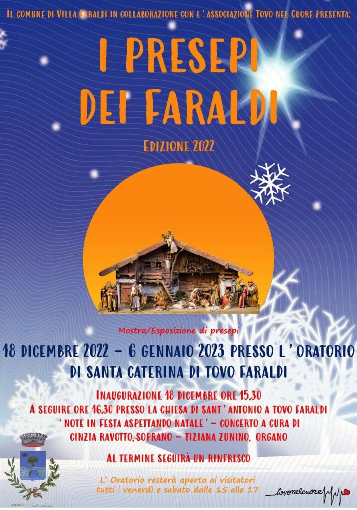 L’associazione Tovo nel cuore aps, in collaborazione con il comune di Villa Faraldi organizza la seconda edizione dei “Presepi dei Faraldi“. L’inaugurazione della mostra avrà luogo domenica 18 dicembre, alle ore 15,30, presso l’oratorio di Santa Caterina a Tovo Faraldi.