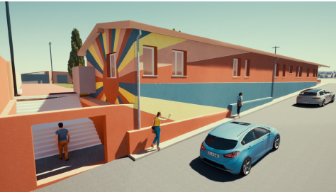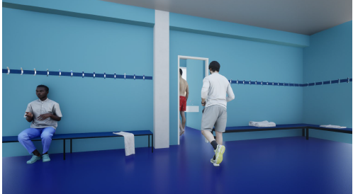 Il percorso che porta all’ingresso del campo da calcio, invece, verrà realizzato in cls drenante colorato in massa con le tinte della terra e tipiche dei borghi liguri, che caratterizzeranno anche i colori delle facciate dell’edificio spogliatoi, dei muri di cinta e del piazzale.