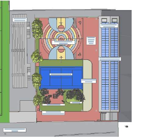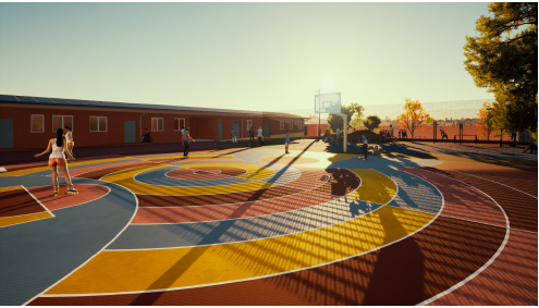 Il piazzale sarà dotato di canestri da pallacanestro e la pavimentazione in resina dura studiata specificatamente per le piste di pattinaggio, avrà un uso multifunzionale: sarà decorata con colori e con le linee dei campi di basket in modo da poterlo utilizzare come campetto da gioco e, grazie alla finitura specifica della pavimentazione, potrà essere utilizzata come pista da pattinaggio a rotelle anche artistico, struttura attualmente assente in città . Le linee decorate contribuiranno anche alla riqualificazione e attrazione dell’area.