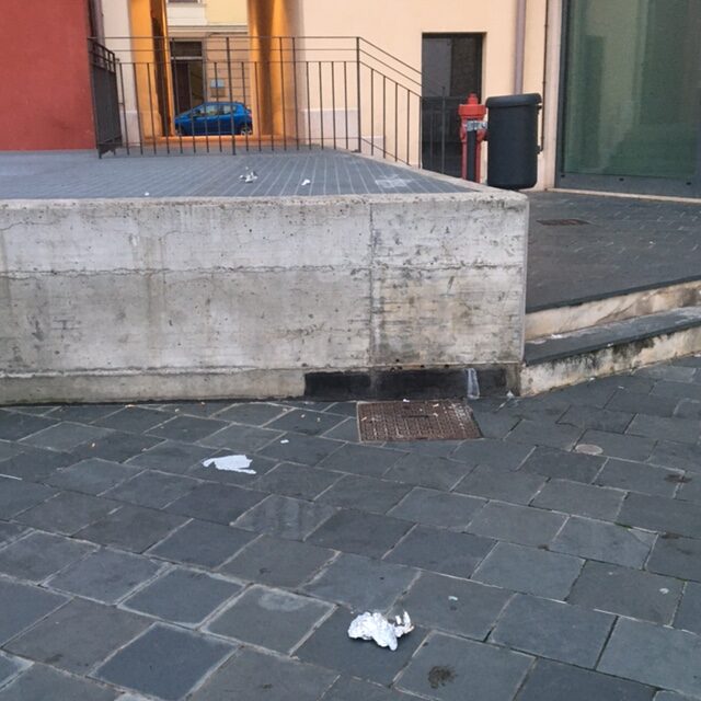 “Vorrei con queste poche righe denunciare nuovamente lo stato vergognoso in cui versa la piazzetta della camera di commercio, nel cuore di Oneglia in pieno centro, in una zona che dovrebbe essere il biglietto da visita della città , a due passi da piazza Dante .