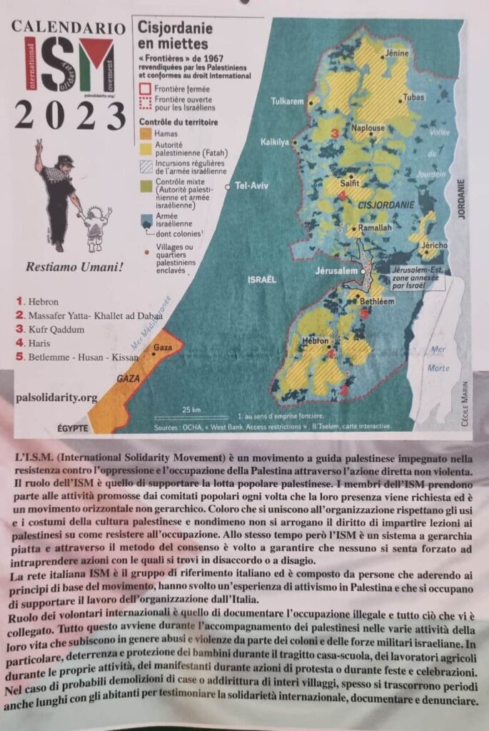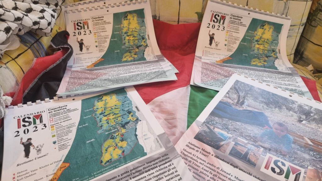 Il nostro progetto si basa su un principio: sono bastati pochi giorni per accorgersi del popolo ucraino mentre sono 75 anni che la gente non si accorge del popolo palestinese. Ecco perchè è importante questa nostra piccola azione che risponde alla volontà del popolo palestinese che ci chiede di far sapere al mondo ciò che accade. Nel nostro calendario mostriamo l’immagine di uno dei bambini di una famiglia la cui casa è già stata incendiata due volte dai coloni. In quella colonia i rabbini insegnano da generazioni che uccidere gli arabi è giusto, è il volere di Dio. Questo, chiariamolo, tanti studiosi ebrei lo dichiarano falso. Lui con la sua famiglia è vittima da anni di queste persecuzioni.