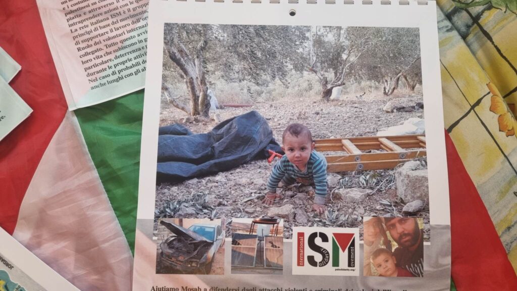 Recentemente è stato assalito mentre si trovava in auto. È fuggito per miracolo riuscendo a salvare anche suo figlio e poi i coloni hanno incendiato la macchina. Noi vogliamo prima di tutto che queste cose si sappiano e poi, con la vendita di questo calendario e altre offerte, vogliamo raccogliere fondi per aiutarli a costruire una recinzione che difenda la casa e tutto l’oliveto che è davanti. Vogliamo proteggerli. Sarà poco? Noi avremo fatto la nostra parte.