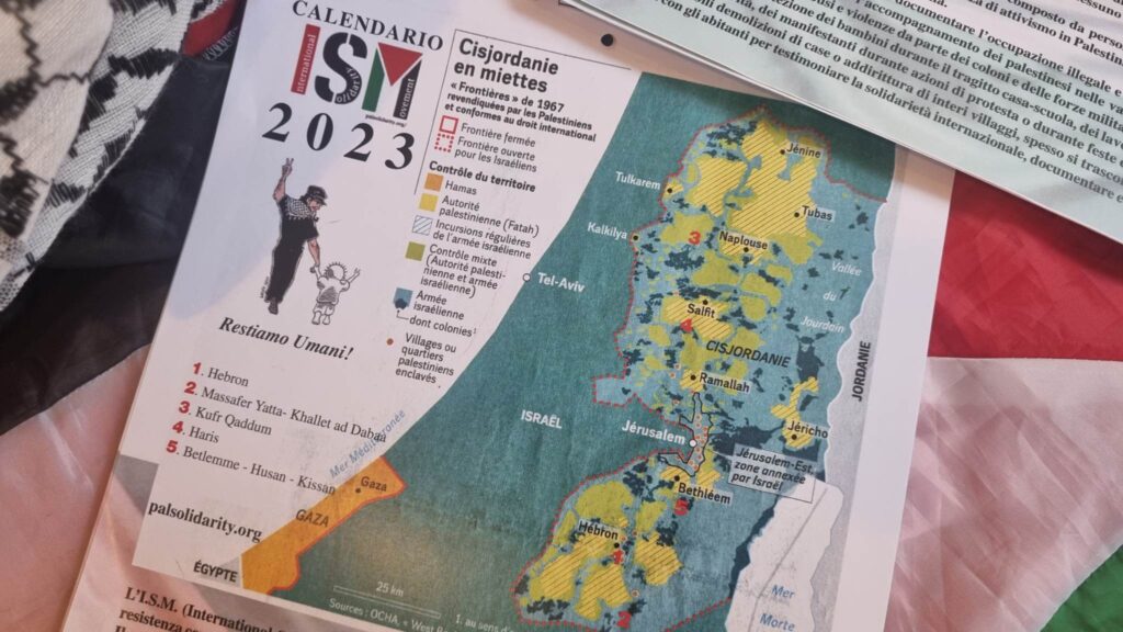 Nella cartina di apertura del calendario abbiamo elencato i posti in cui siamo stati. In questo girovagare tra attivismo e militanza abbiamo visto quanto è grave la situazione e quanto viene perseguitato il popolo palestinese in queste zone, una persecuzione che può avvenire attraverso la presenza delle forze israeliane militari durante la raccolta delle olive, attraverso la coercizione del popolo che vive in quei luoghi, attraverso la repressione delle manifestazioni con i gas. Vengono colpiti anche i bambini. Le persone subiscono una violenza costante da parte dei militari e non solo. Due brutte esperienze le abbiamo avute con i coloni israeliani che attaccano costantemente gli oliveti e gli abitanti di queste zone, colpendoli, ferendoli, demolendo le loro auto, distruggendo le coltivazioni che sono il loro patrimonio di vita.
