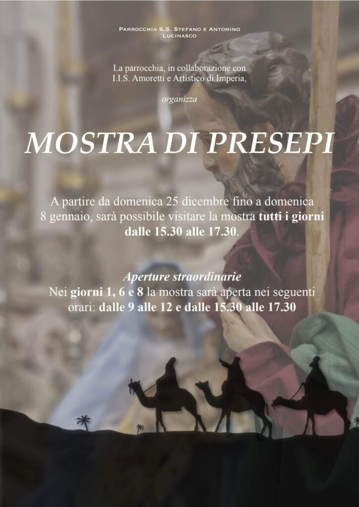 A Lucinasco arriva la mostra di presepi. L’evento è realizzato dalla parrocchia S.S Stefano e Antonio di Lucinasco, in collaborazione con l’I.I.S Amoretti e Artistico di Imperia.