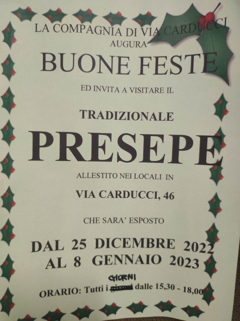 Il Presepe si può visitare fino all’otto di gennaio e arriveranno i Re Magi, mentre andrà via Gelindo, il tipico pastore ligure, che è il primo, nella tradizione ligure, che va a visitare Gesù. Sino all’otto gennaio, dalle 15,30 alle 18, è visitabile il Presepe della Compagnia di Via Carducci e tengo a sottolineare che le offerte raccolte servono a sostenere la realizzazione dell’Infiorato del Corpus Domini, in quanto ogni anno andiamo sempre molto sotto con le spese ed è sempre difficile fare l’Infiorata“.